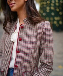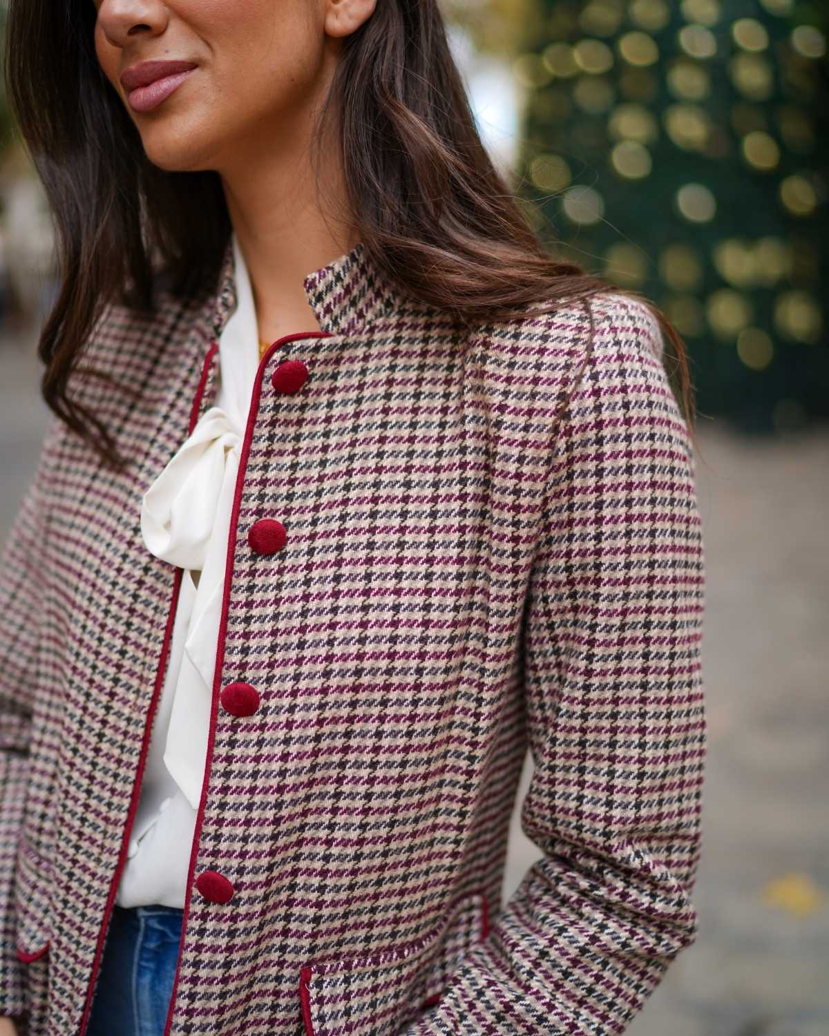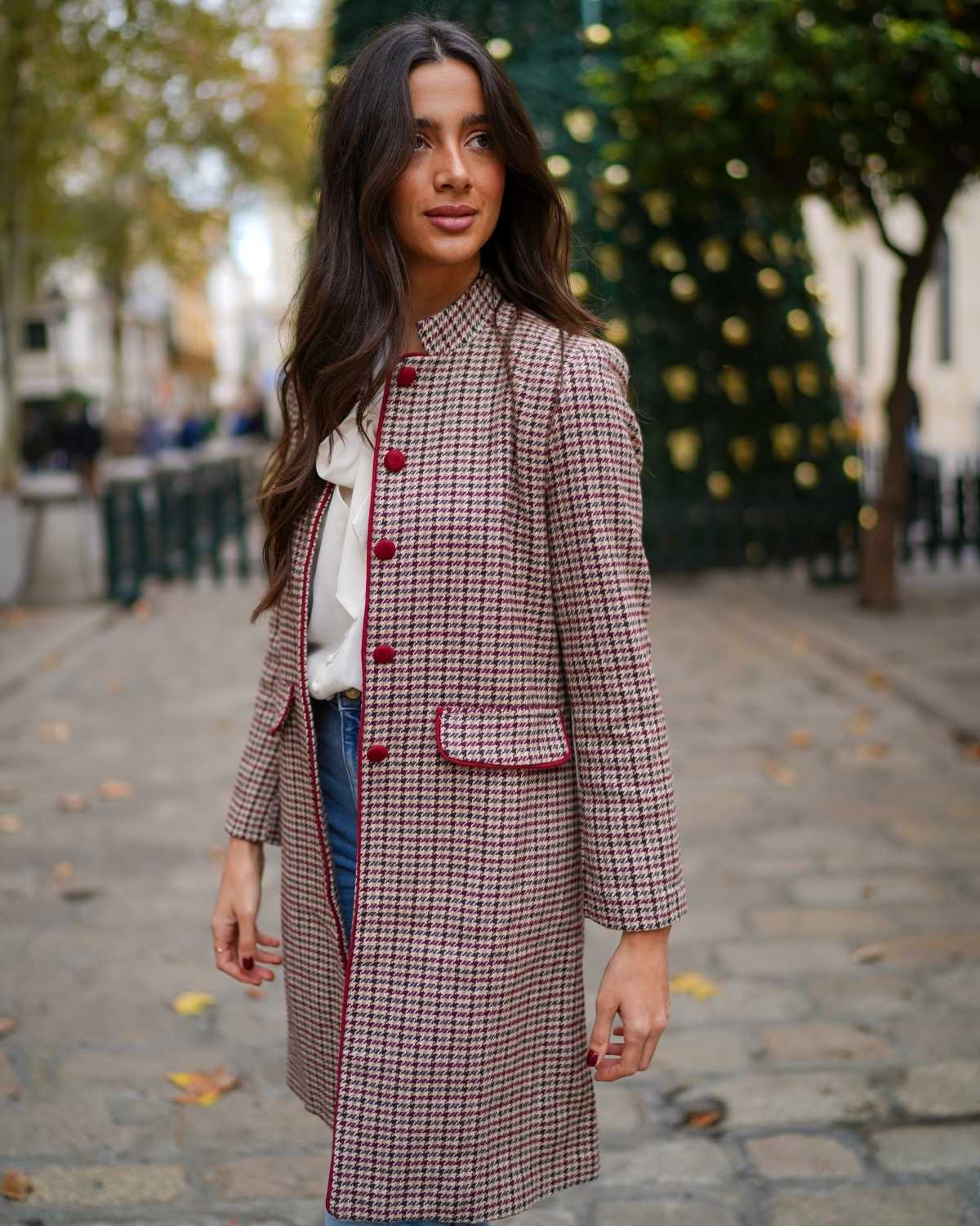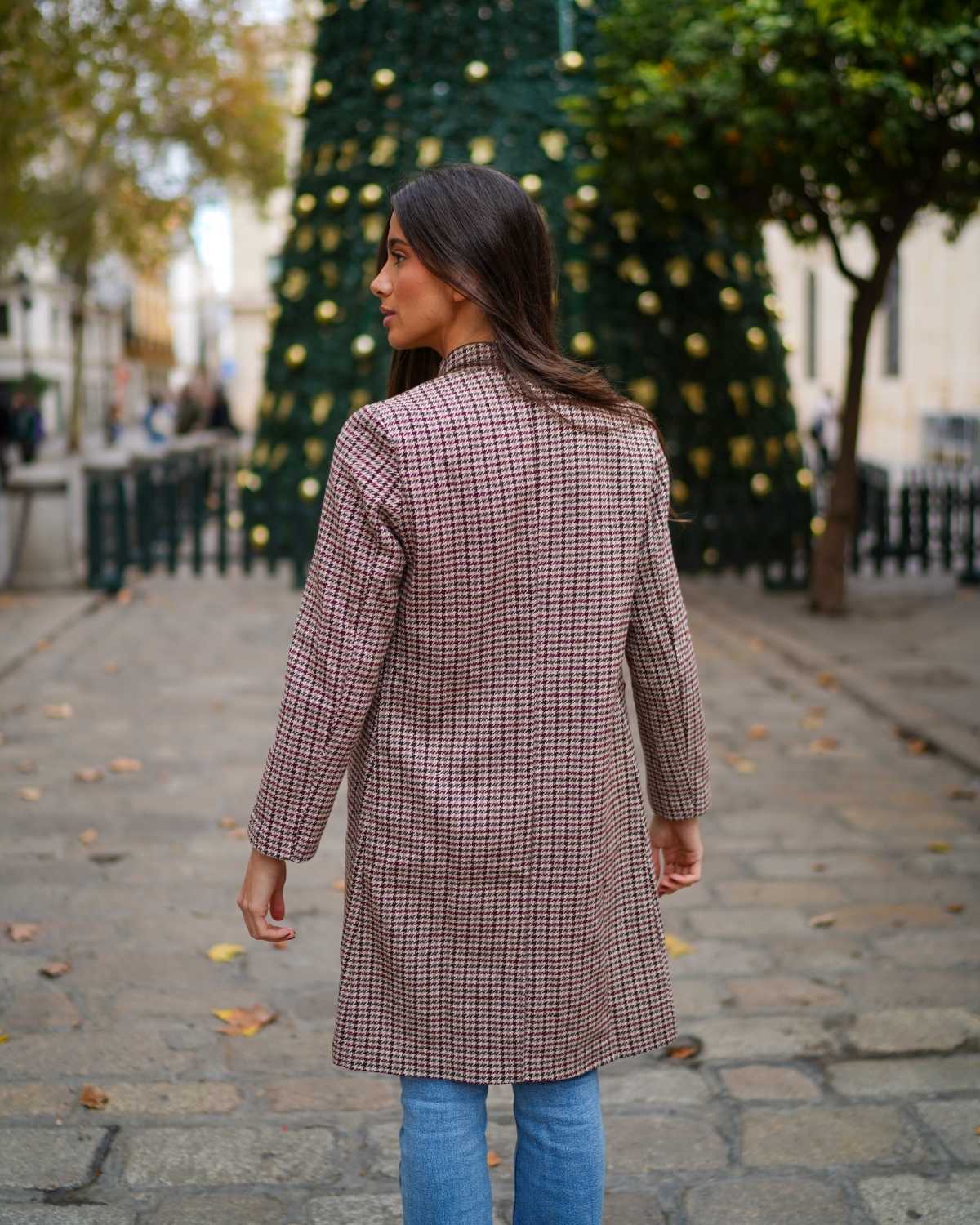 - Chaqueta midi con estampado de pata de gallo, manga larga y hombreras.