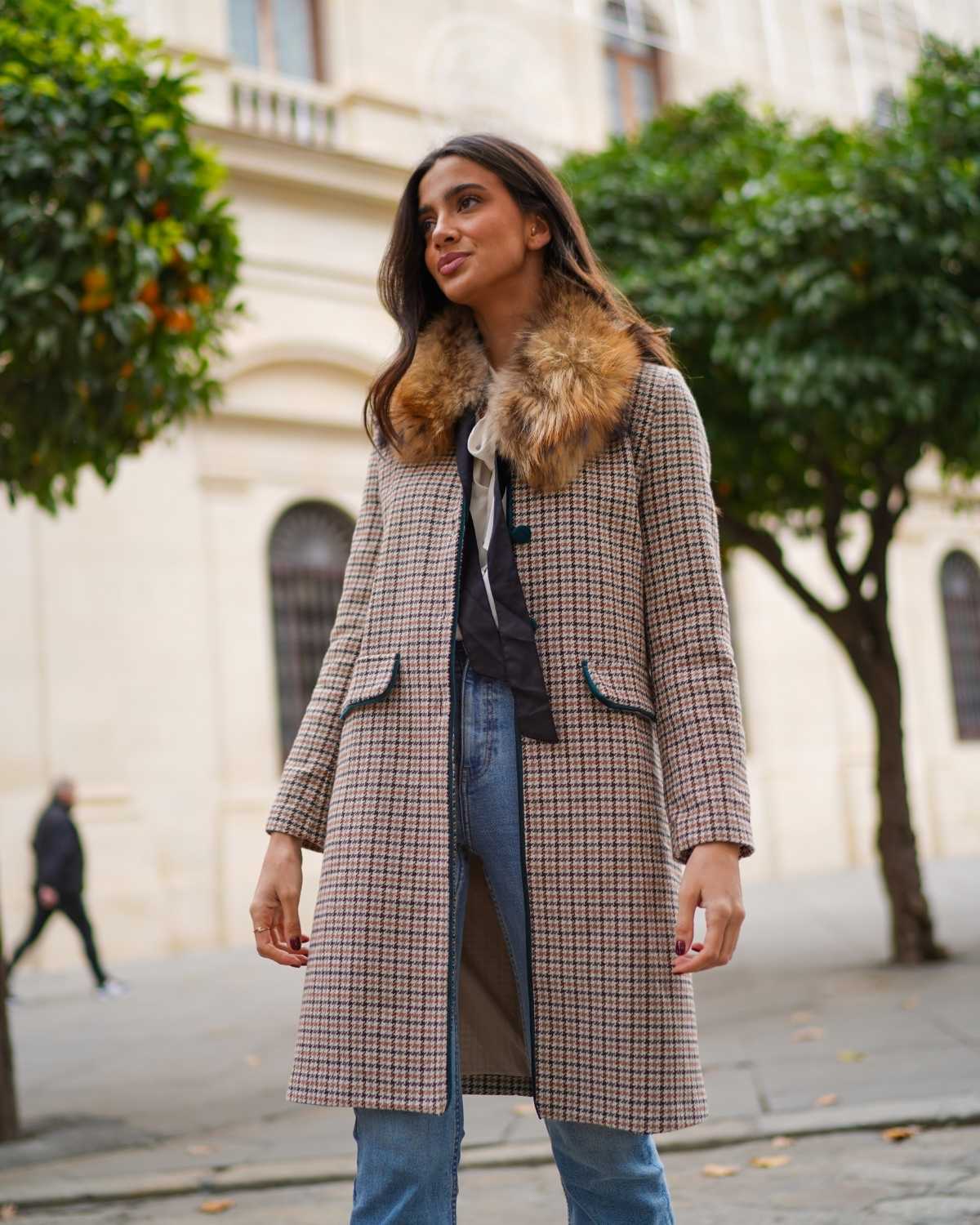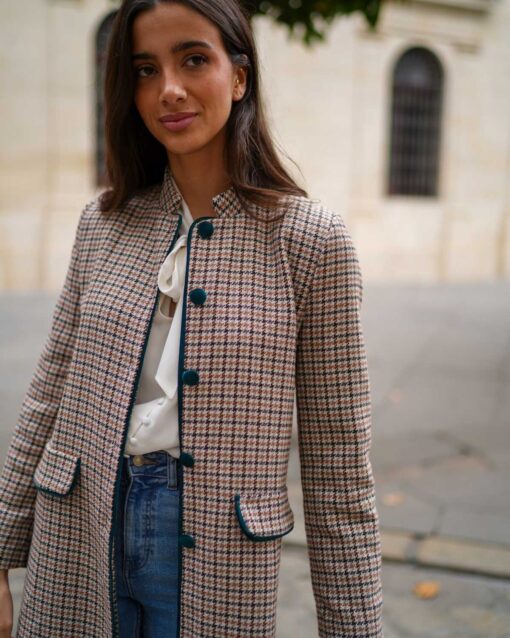 - Chaqueta midi con estampado de pata de gallo, manga larga y hombreras.
