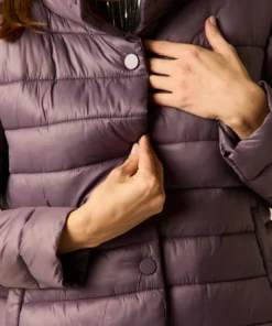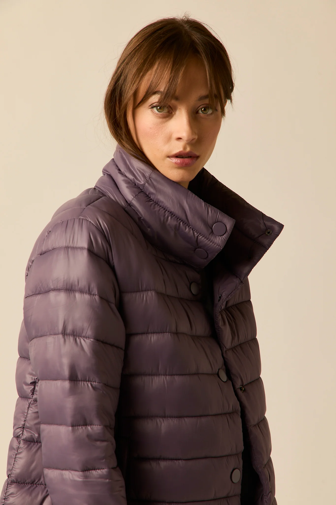 Abrigo de plumas acolchado en color morado. Cuello chimenea, manga larga, dos bolsillos laterales, forro interior y cierre frontal de botones.