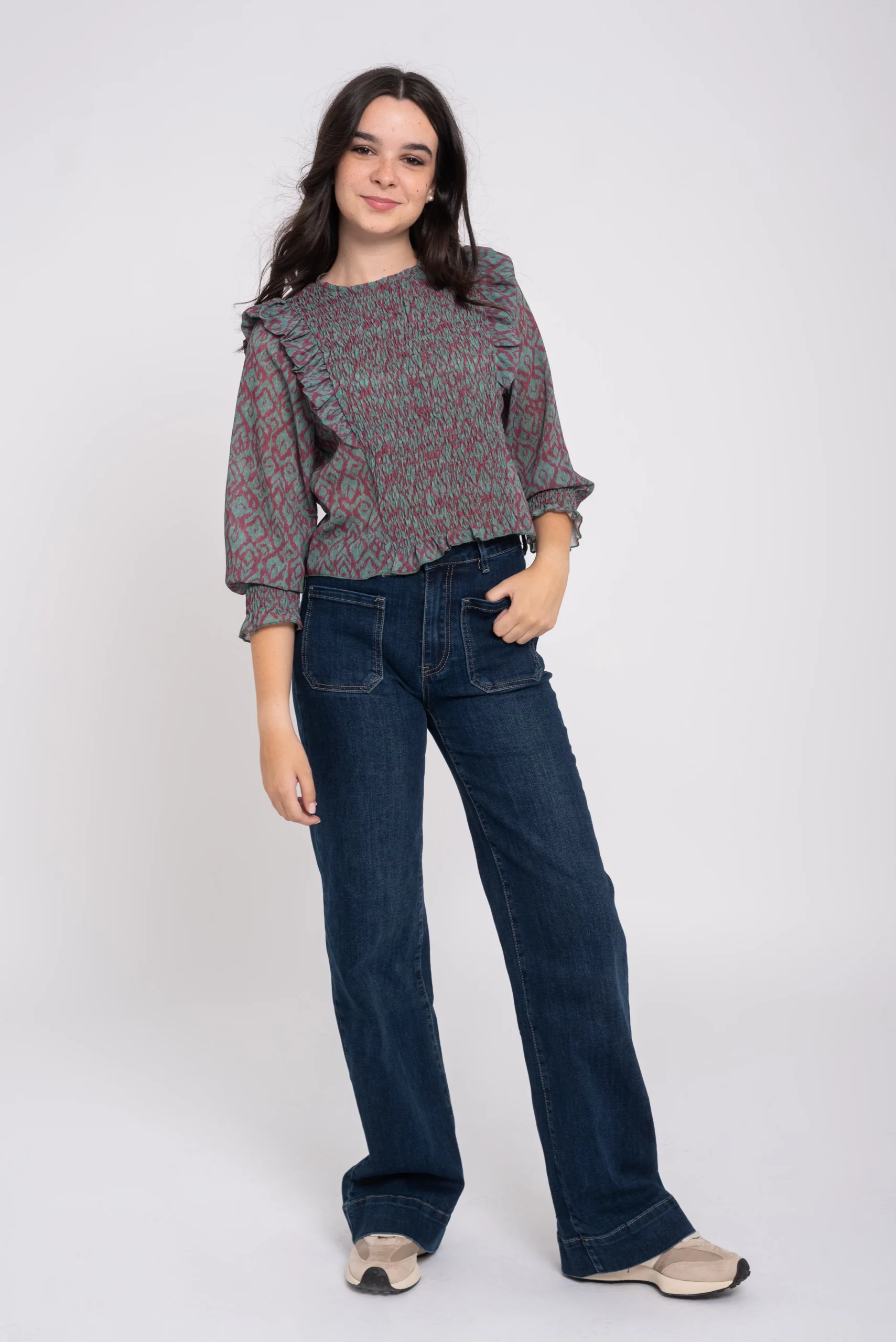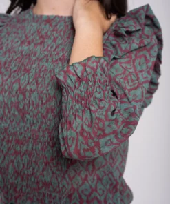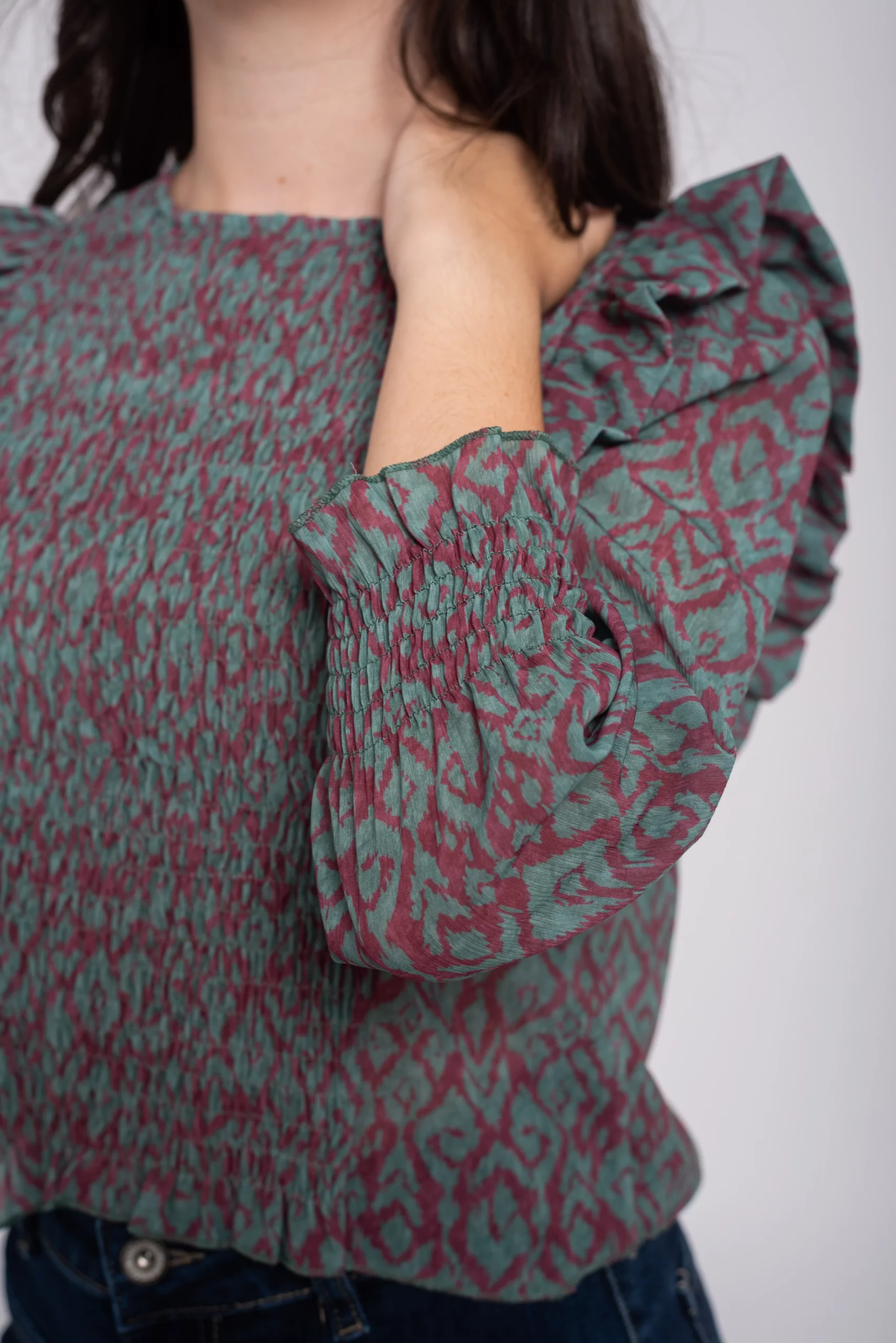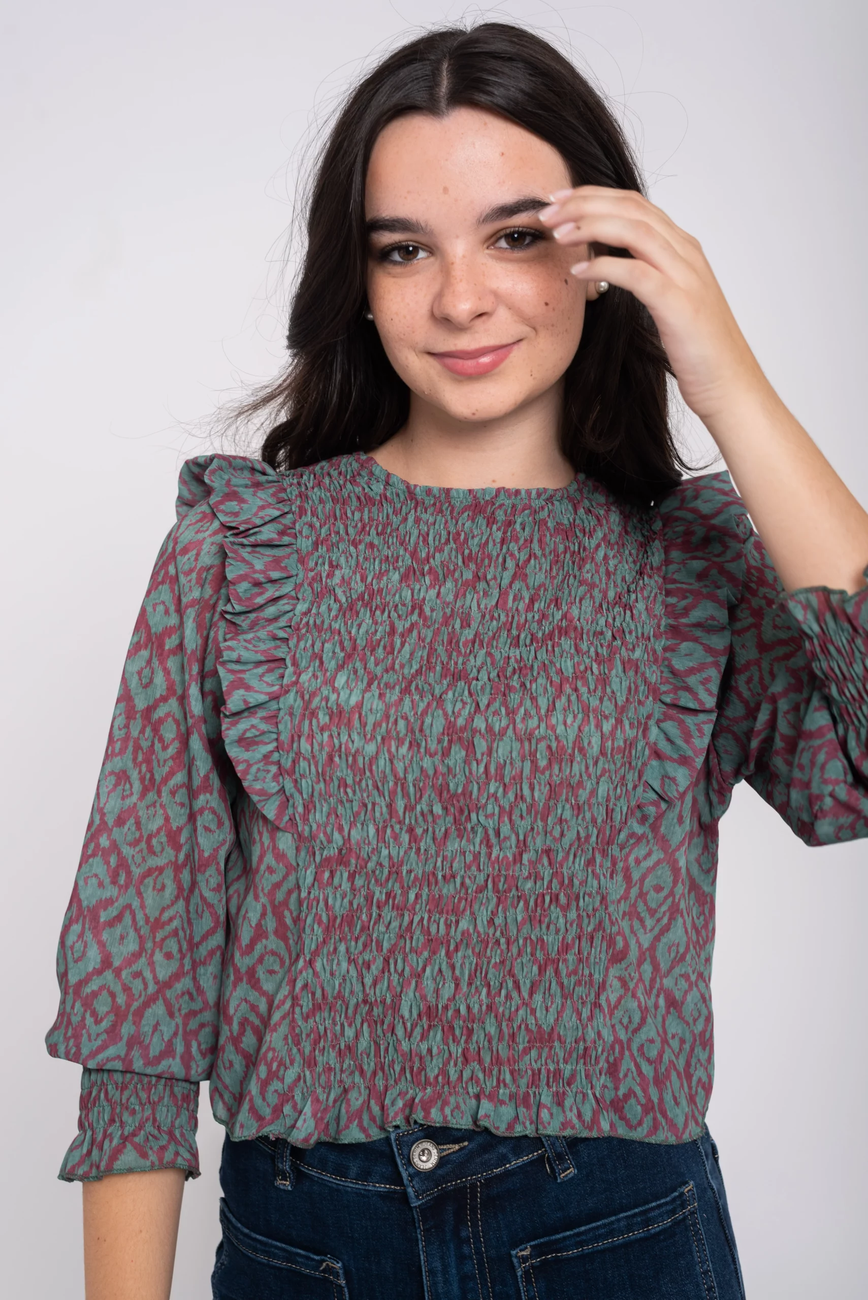Blusa cuello redondo y manga larga. Frunce nido de abeja sobre el pecho. Manga larga con detalle de volante sobre el hombro y frunce en el puño. Largo a cintura. Estampado.