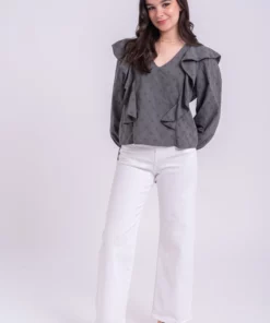 Blusa cuello redondo y manga larga. Frunce nido de abeja sobre el pecho. Manga larga con detalle de volante sobre el hombro y frunce en el puño. Largo a cintura. Estampado.