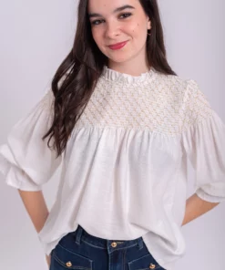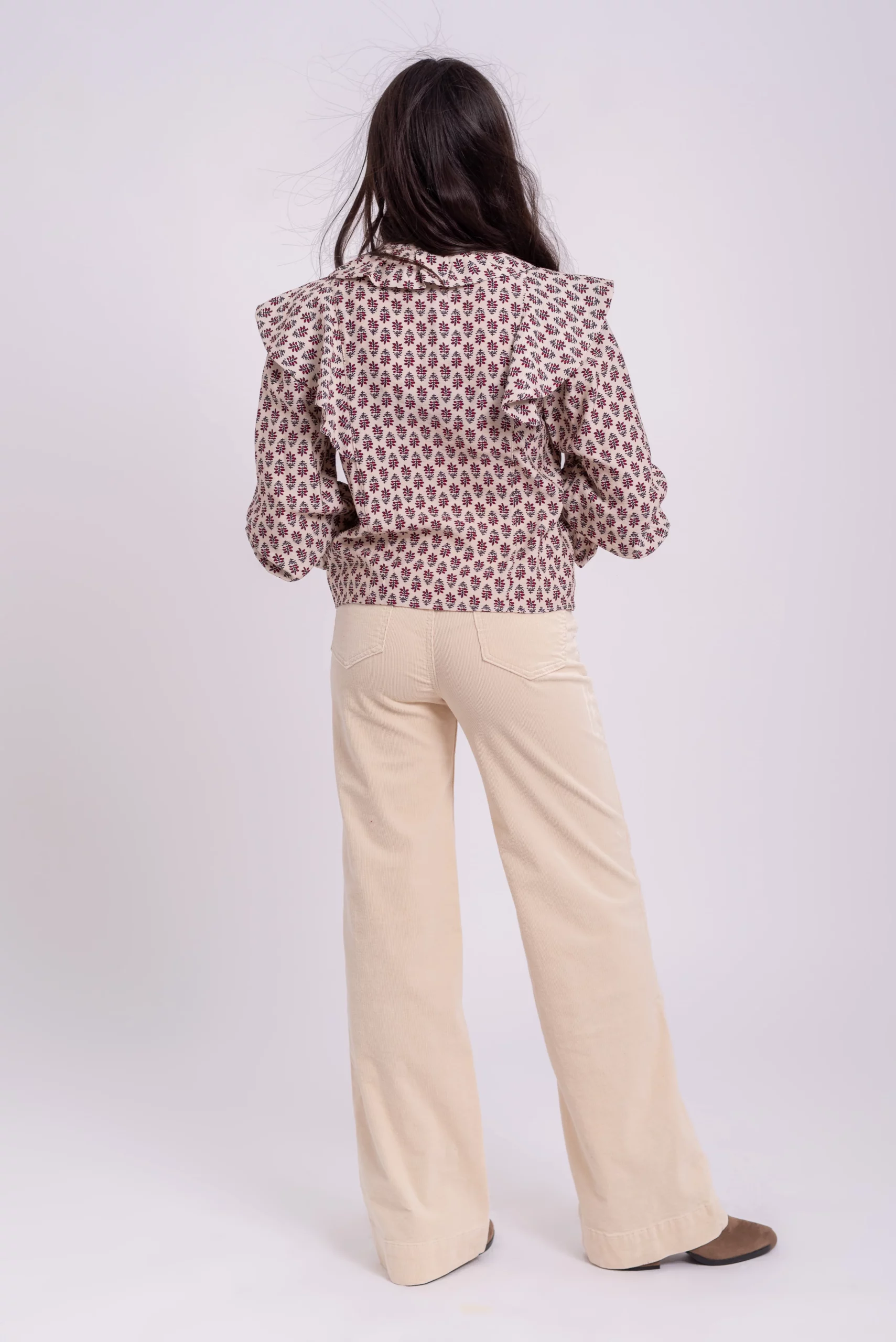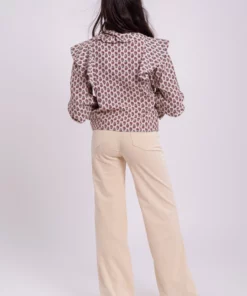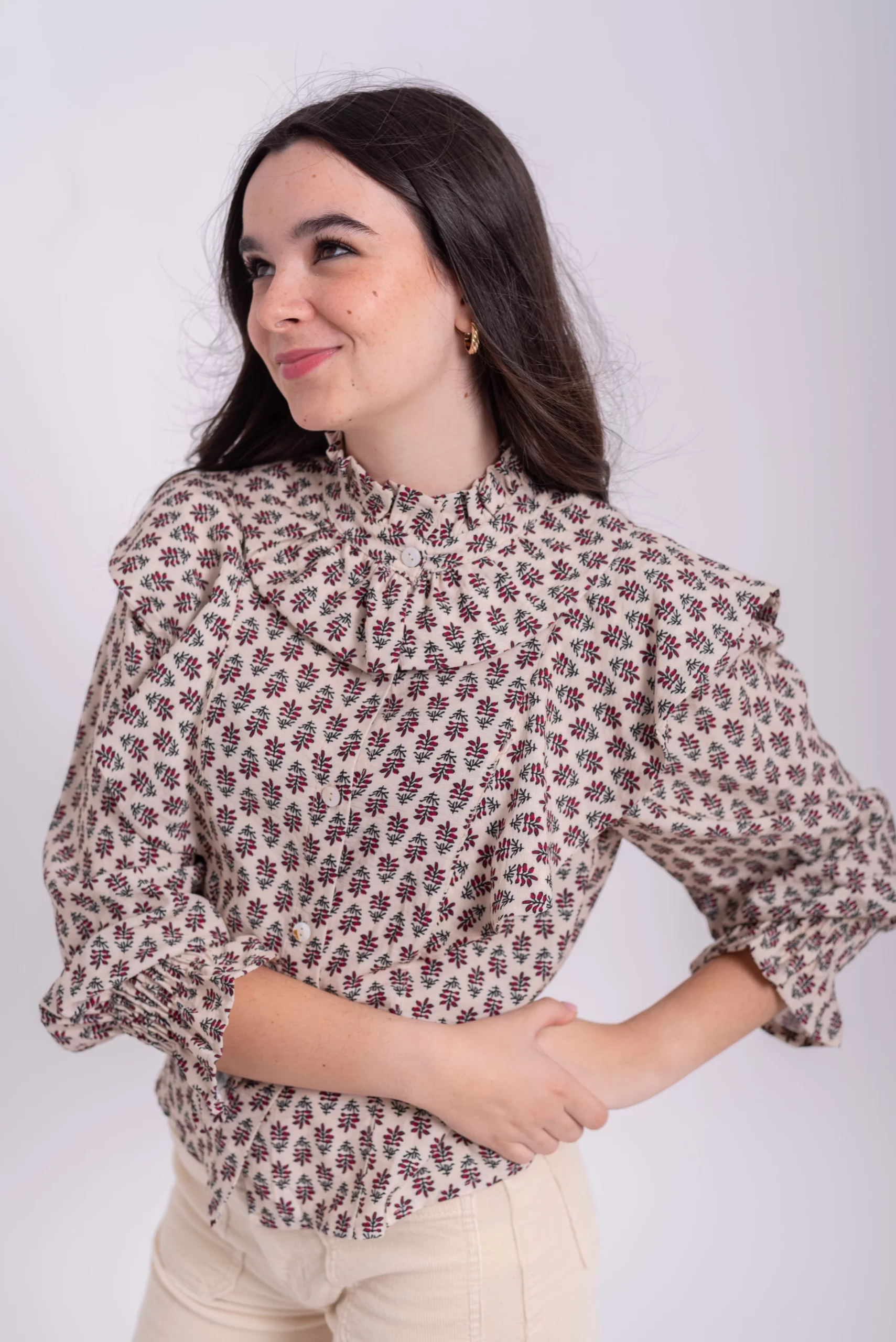 Blusa, cuello redondo. Manga larga. Abotonada sobre el pecho. Detalle de volante alrededor del cuello y sobre los hombros. Estampado floral.