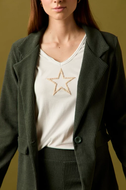Americana de pana en color verde kaki. Cuello de solapa, manga larga, falsos bolsillos laterales y cierre frontal de un botón.