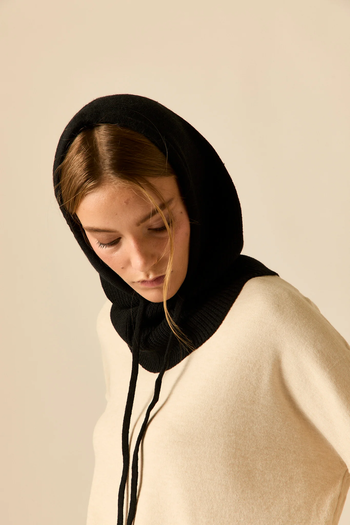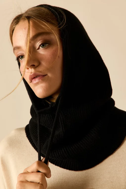 Balaclava de punto en color negro con detalle de cordón y acanalado.