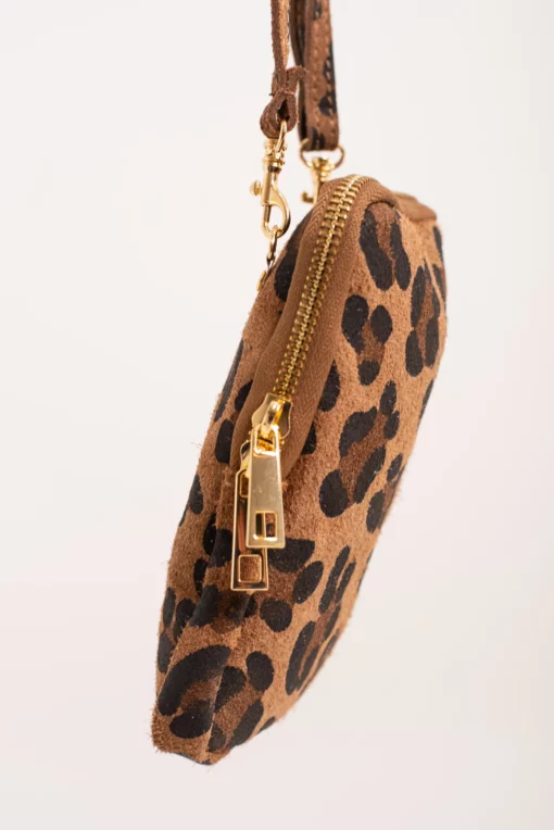 Bandolera de piel, serraje. Estampado en animal print en tono taupe. Cierre cremallera en tono dorado.