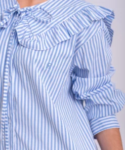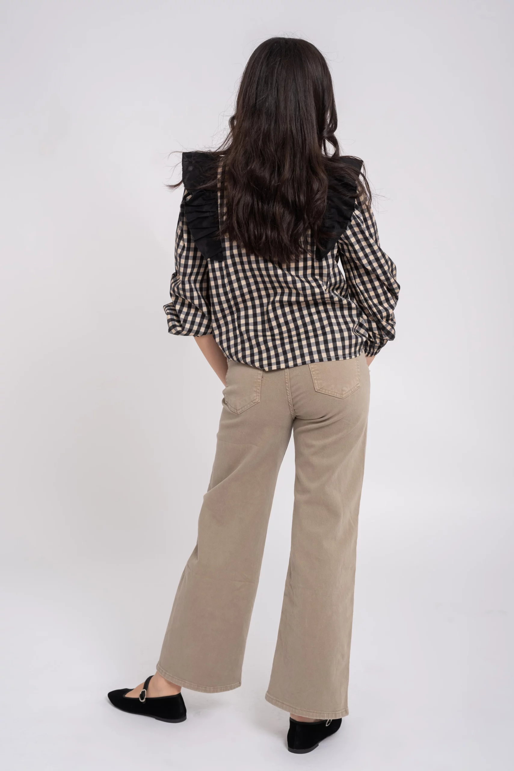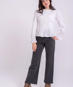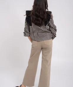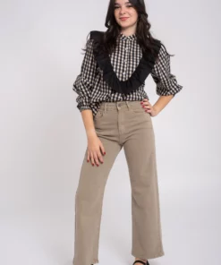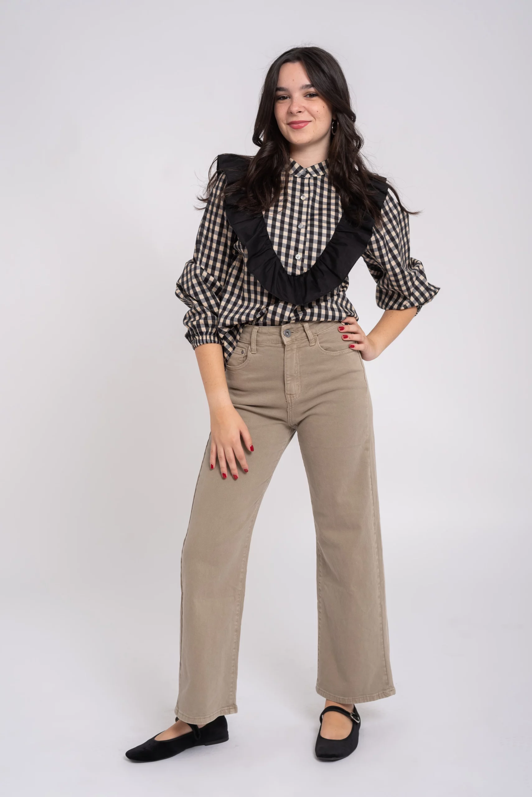 Blusa vichy. Cuello mao. Cierre botones. Detalle de volante en uve sobre el pecho en tono a contraste. Manga larga con goma en puño.