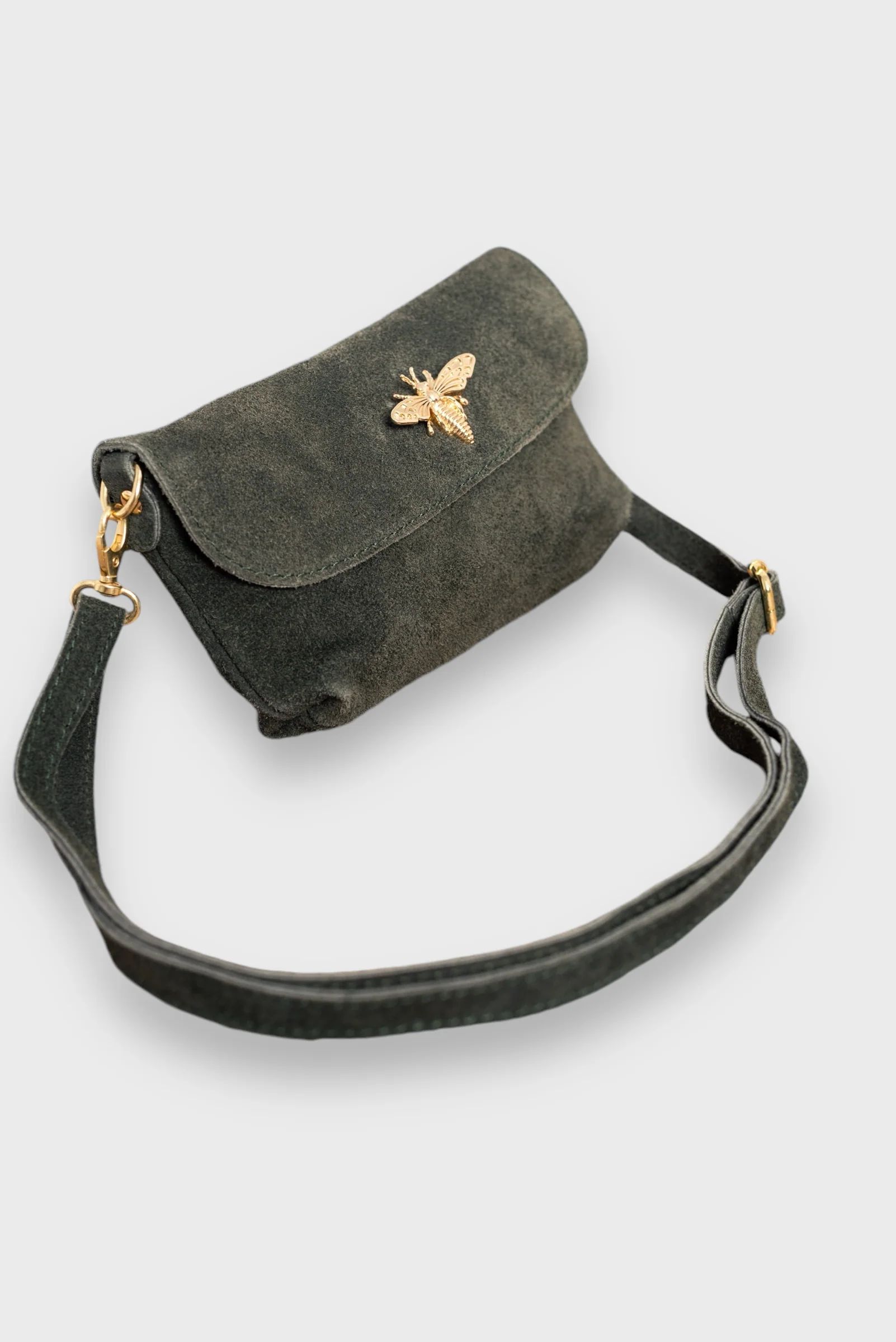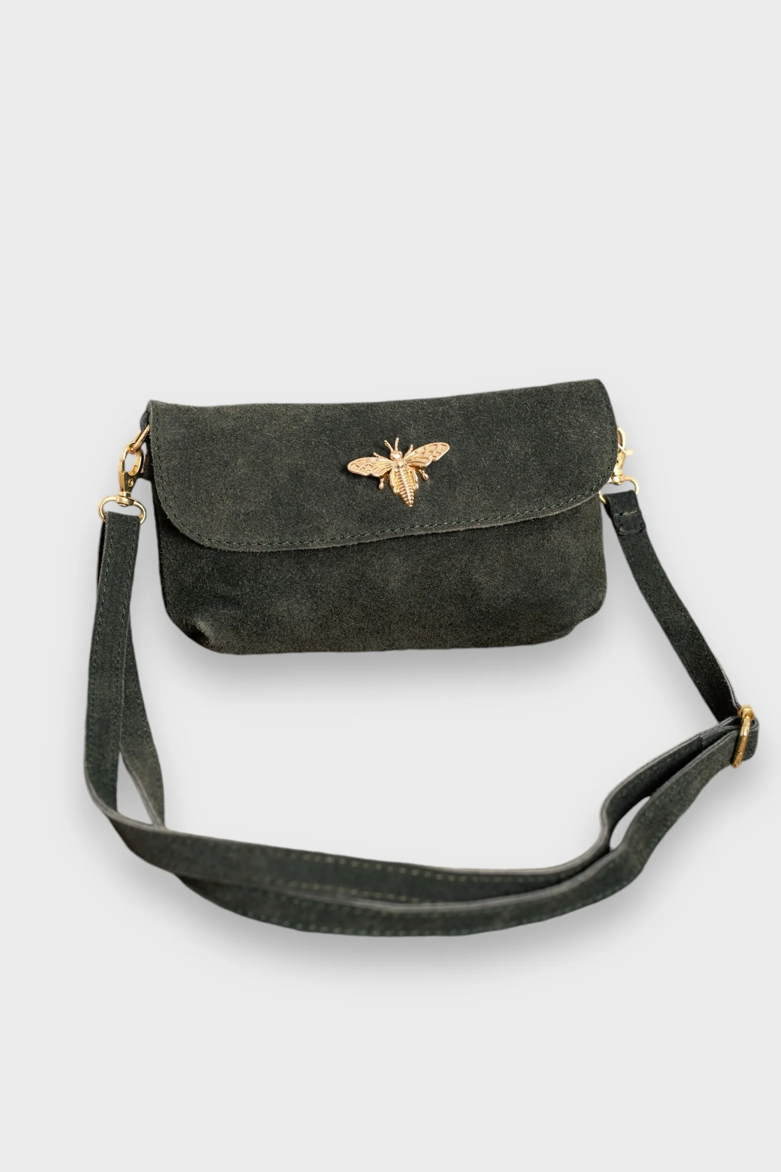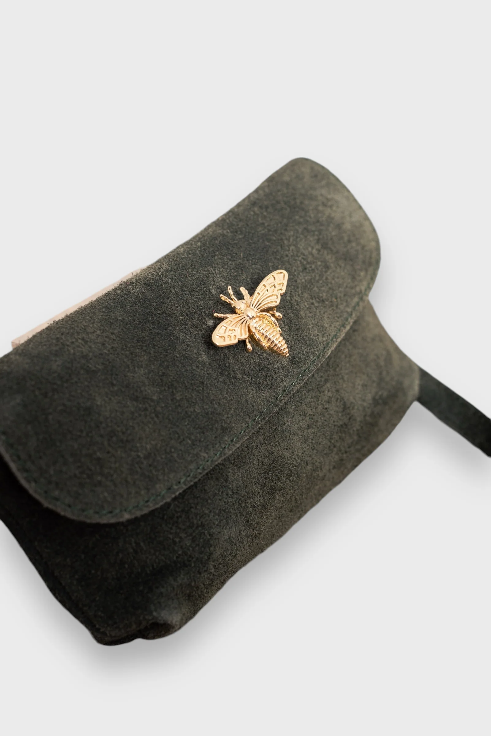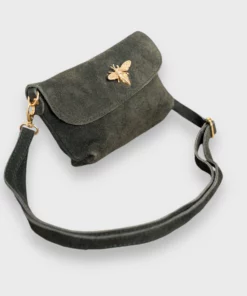 Bolso mini. Solapa con cierre imán. Abejorro dorado en solapa. Cremallera bajo solapa. Serraje. Tira bandolera. Una versión mini de nuestro bolso Bumblebee que podrás usar tanto de mano como de bandolera.