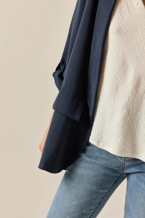 Blazer básica en color azul marino. Diseño clásico, tejido vaporoso, cuello de solapa, manga larga ajustable con botón. Detalle de falsos bolsillos laterales.