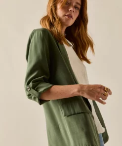 Blazer básica en color verde kaki. Diseño clásico, tejido vaporoso, cuello de solapa, manga larga ajustable con botón. Detalle de falsos bolsillos laterales.