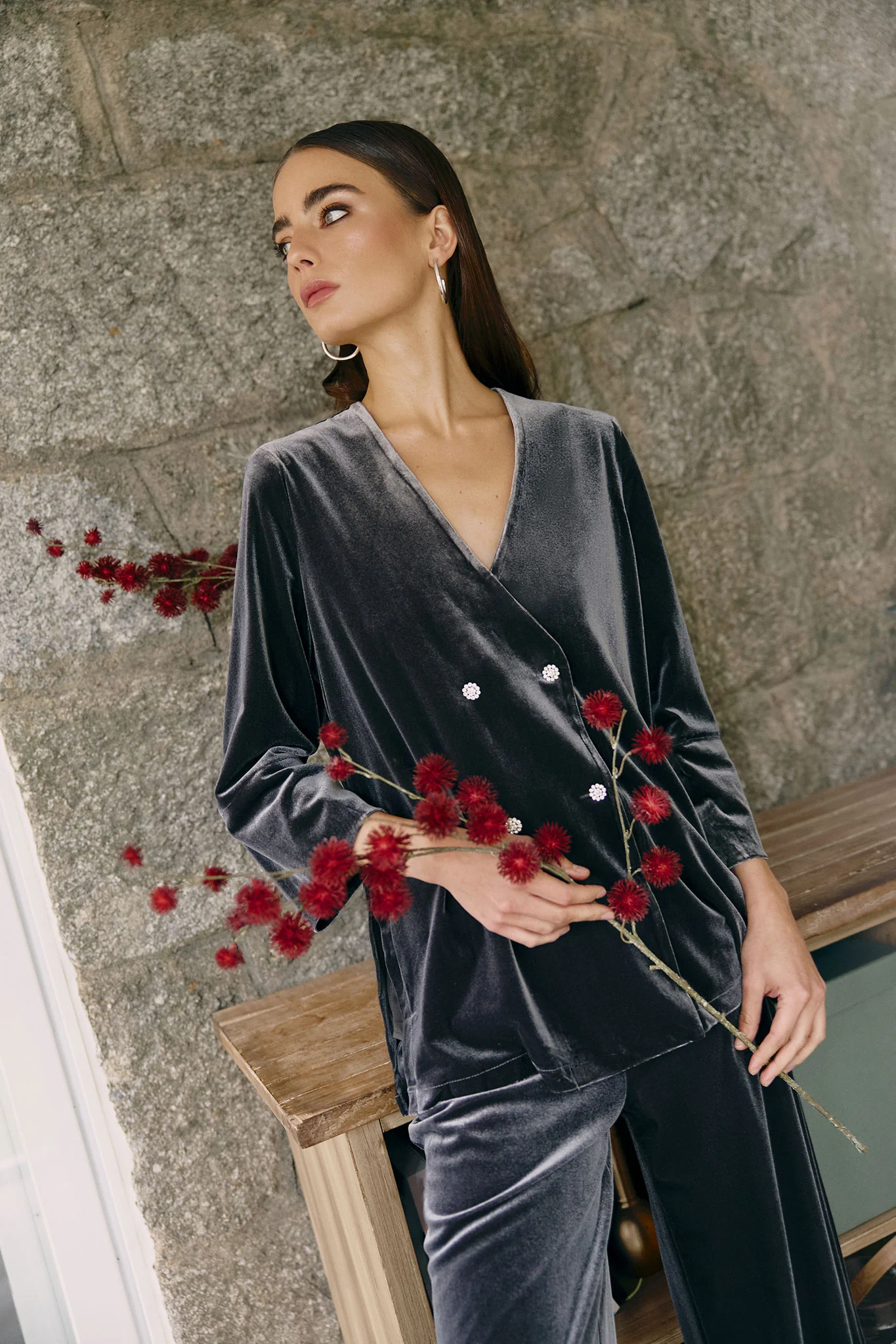 Blazer de terciopelo en color gris. Cuello pico, manga 3/4 amplia, diseño recto y fluido y cierre cruzado de cuatro botones joya.