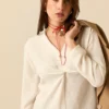 Blusa cropped en color blanco. Cuello caja, manga 3/4 abullonada, escote en la espalda y cierre de lazo.