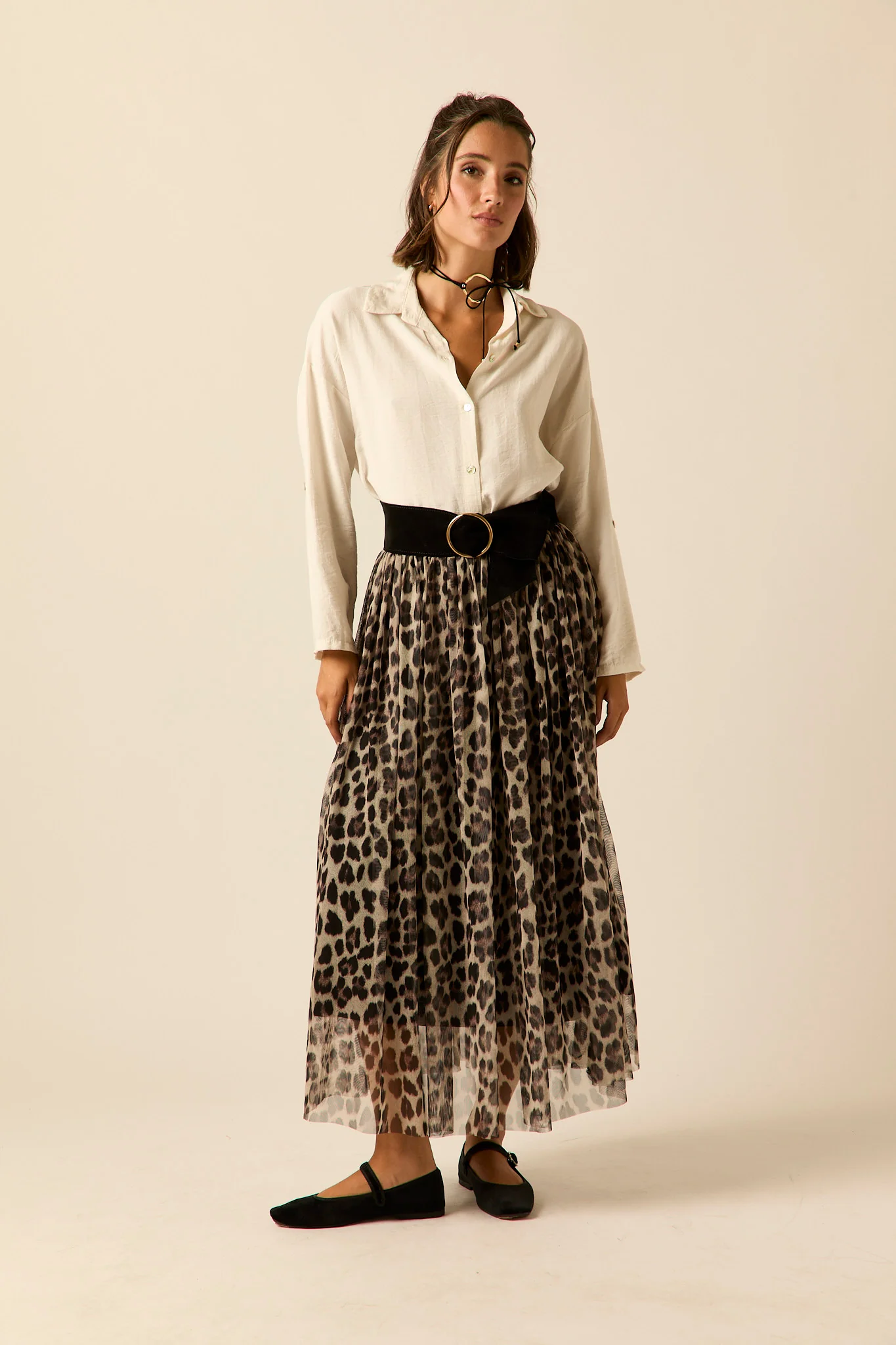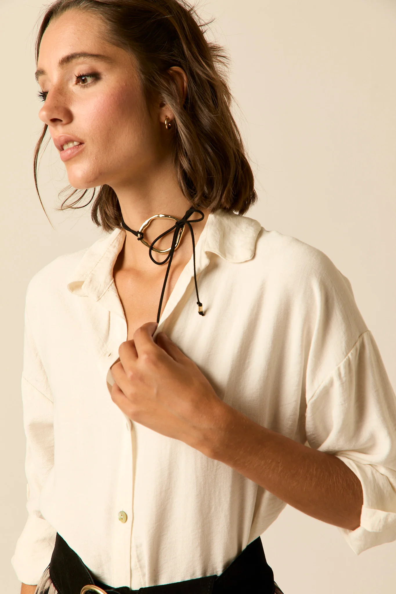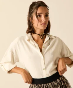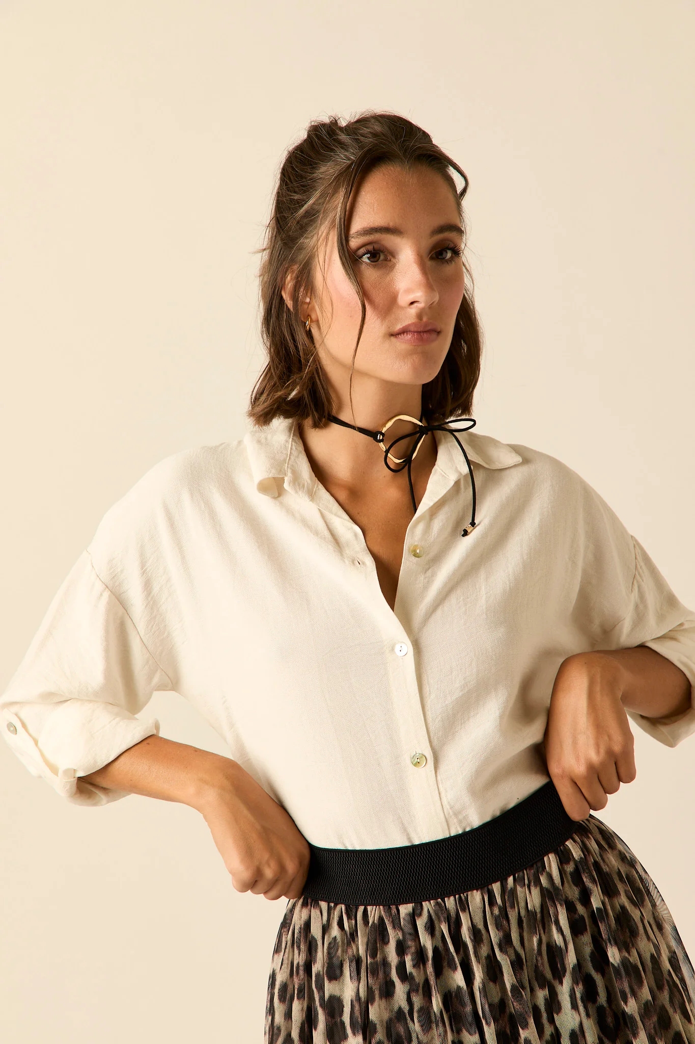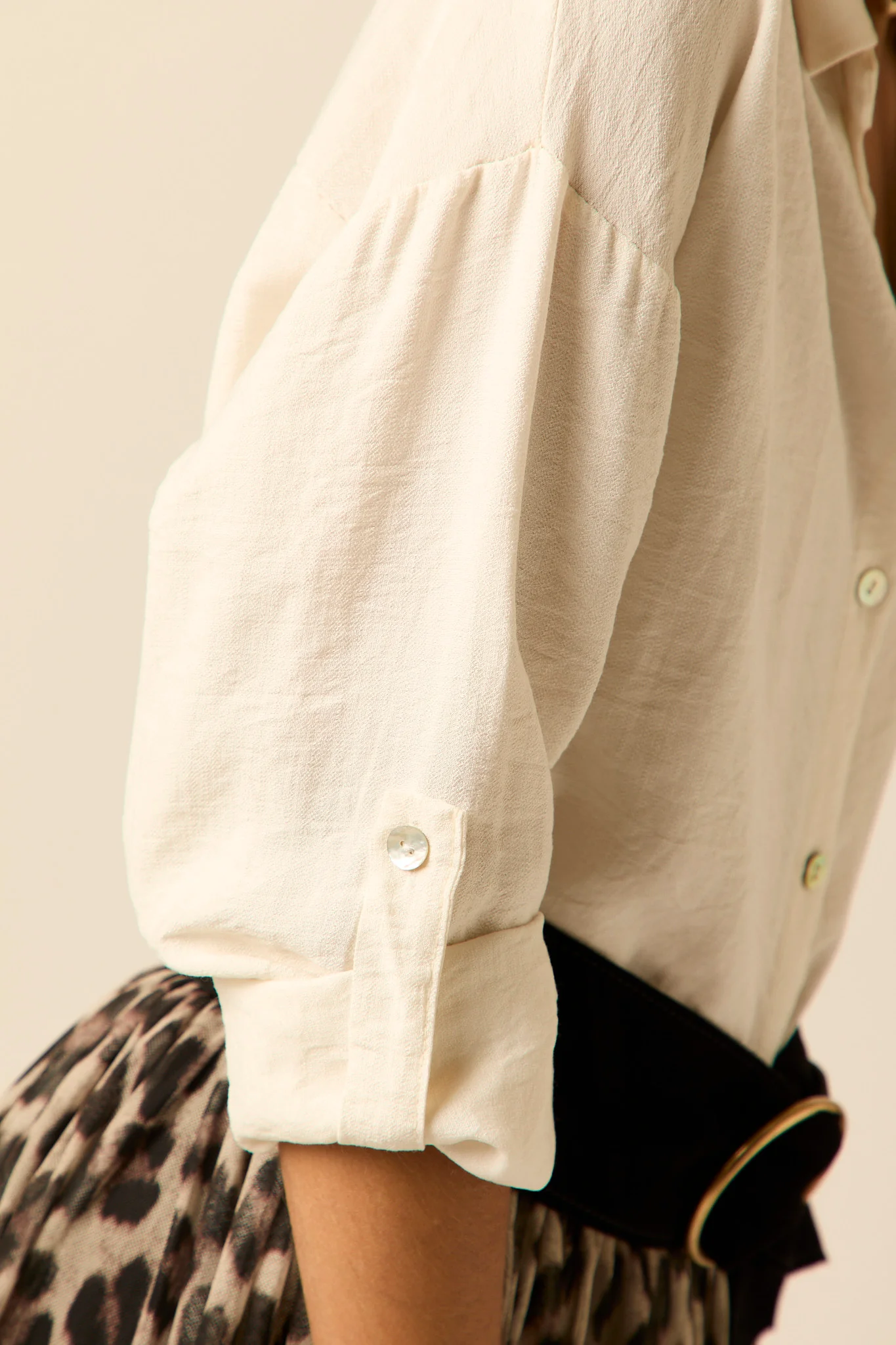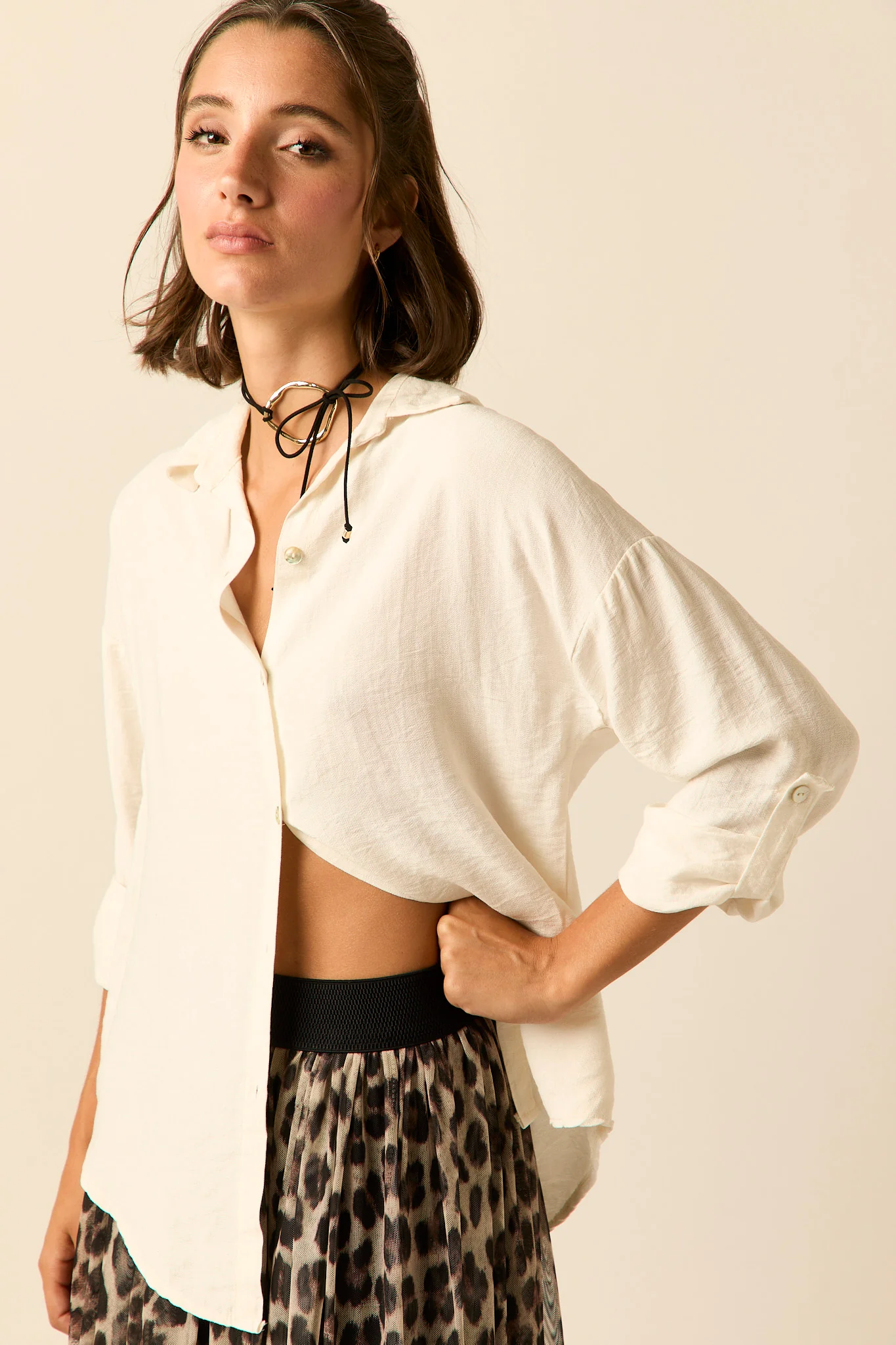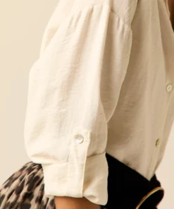 Blusa larga en color blando. Cuello de solapa, manga larga ajustable con botón. Diseño fluido y cierre frontal de botones.