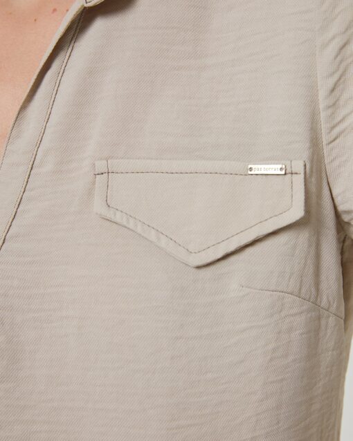 Camisa de manga larga con cuello camisero, con tapetas en el pecho. Cierre frontal con botones y canesú con pliegue en la espalda. Una prenda de siempre con un toque moderno hacen de esta prenda un imprescindible para tu armario