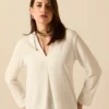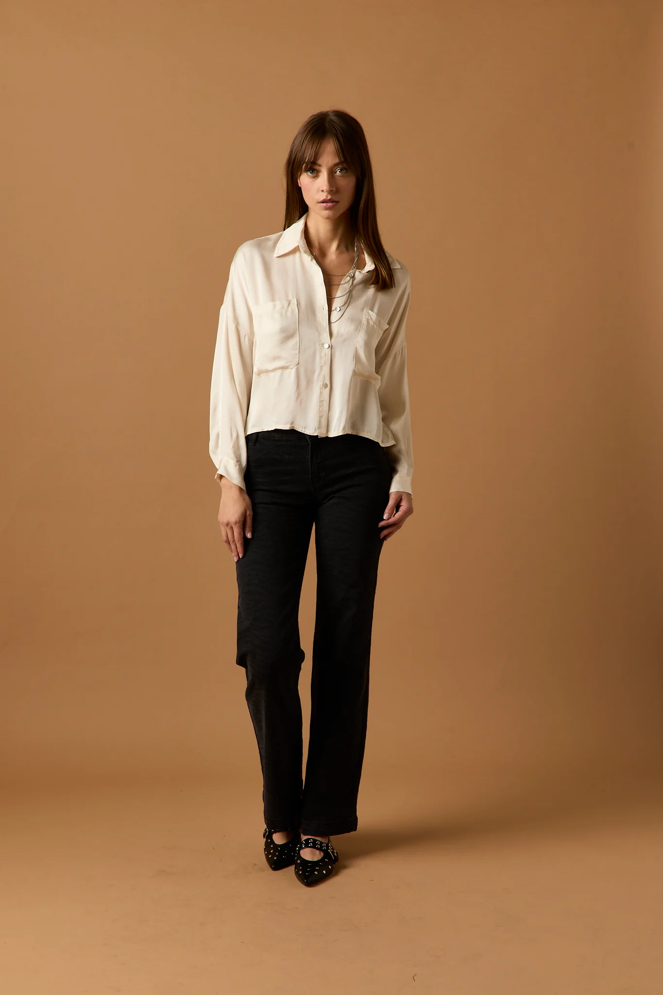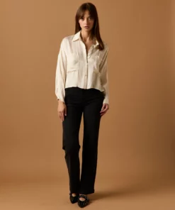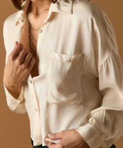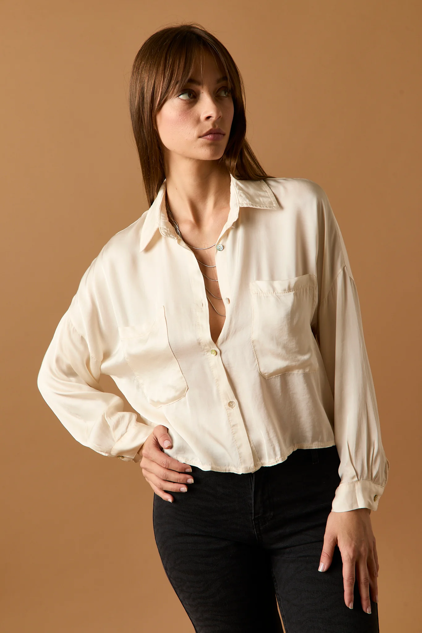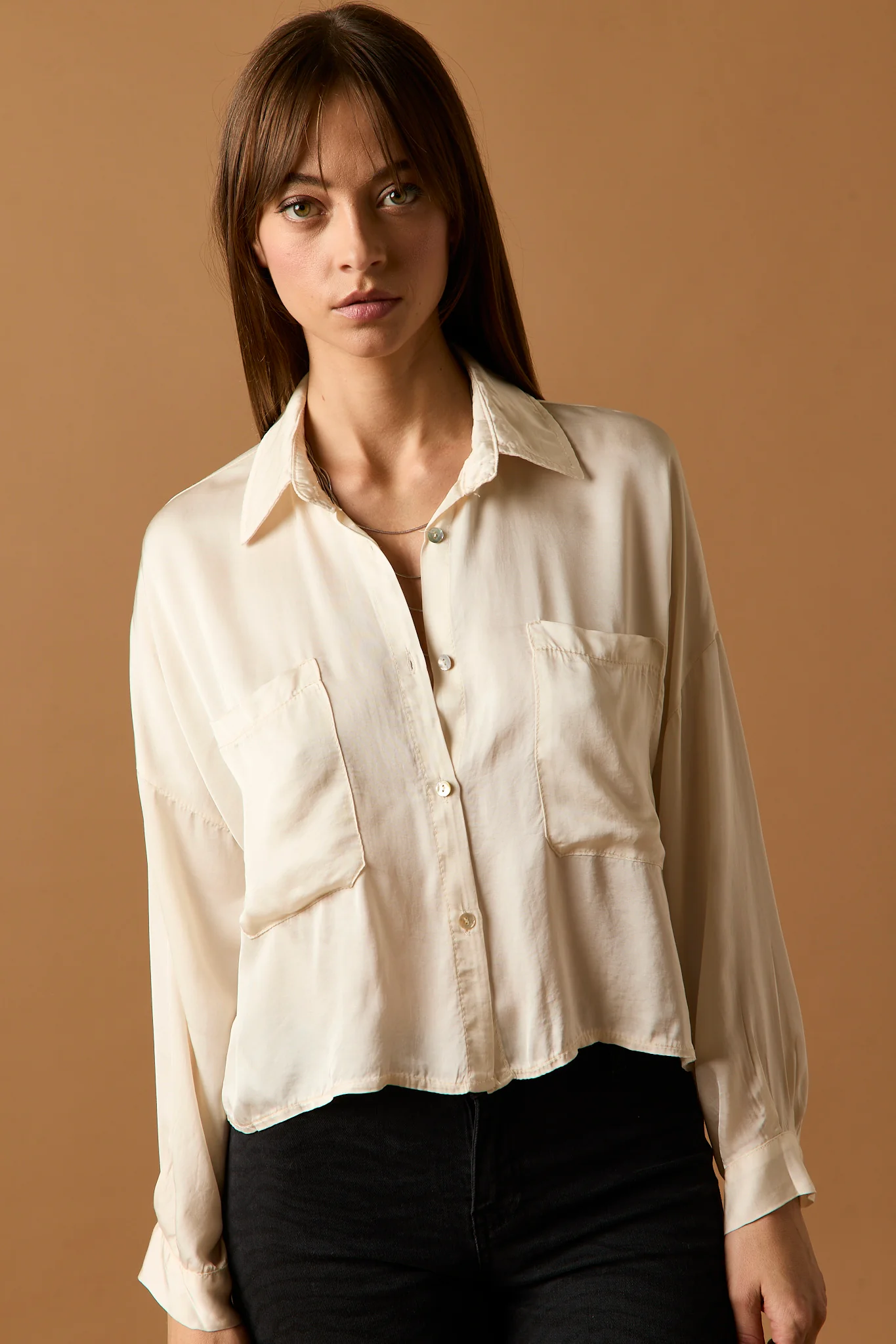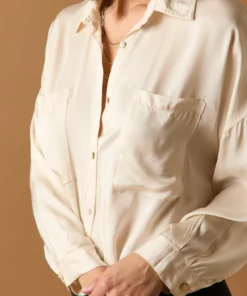 Blusa de raso en color crema. Cuello de solapa, manga larga, dos bolsillos y cierre de botones frontal.