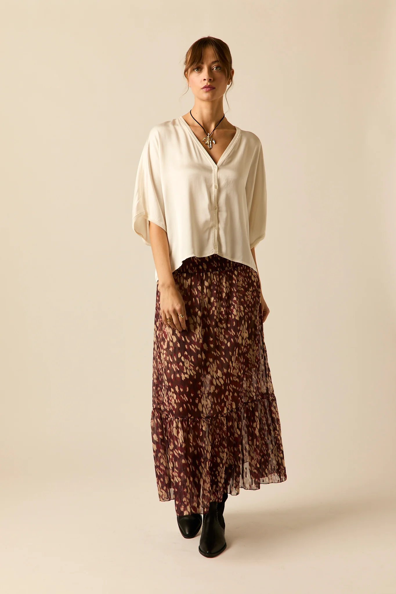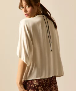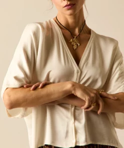 Blusa de raso en color crema. Cuello pico, manga 3/4 amplia y cierre de botones frontal.