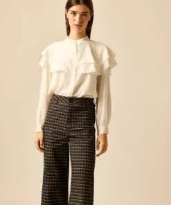 Blusa fluida lisa en color blanco. Cuello mao, manga larga abullonada semi transparente, detalle de volantes en el pecho y cierre frontal de botones.