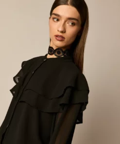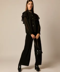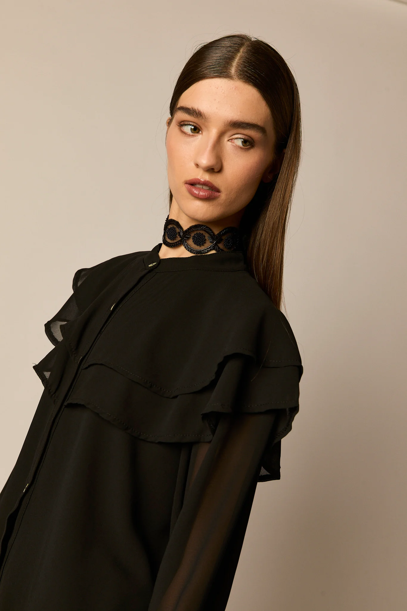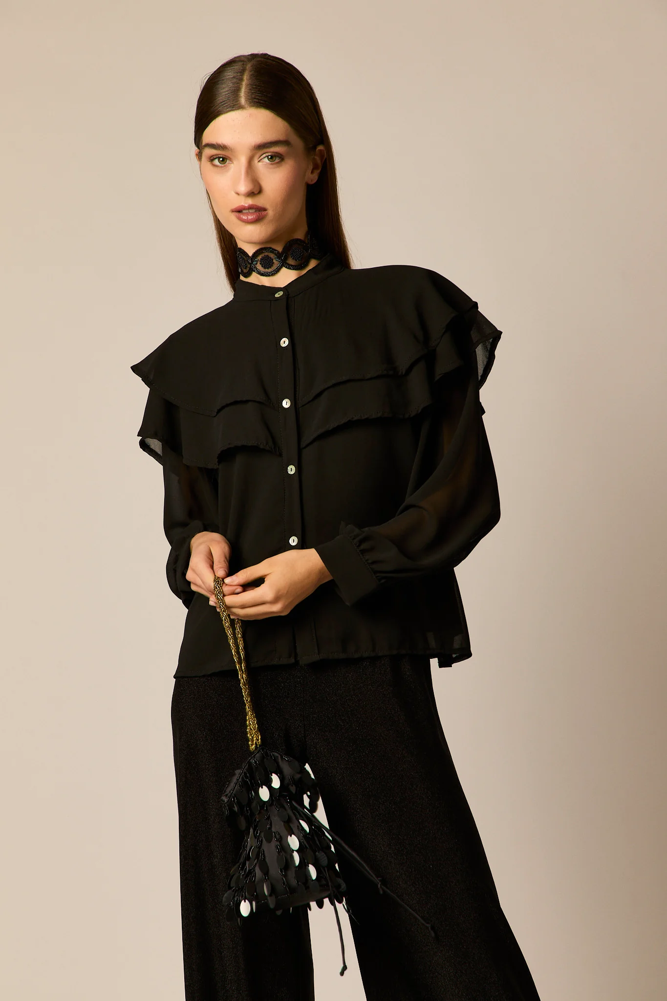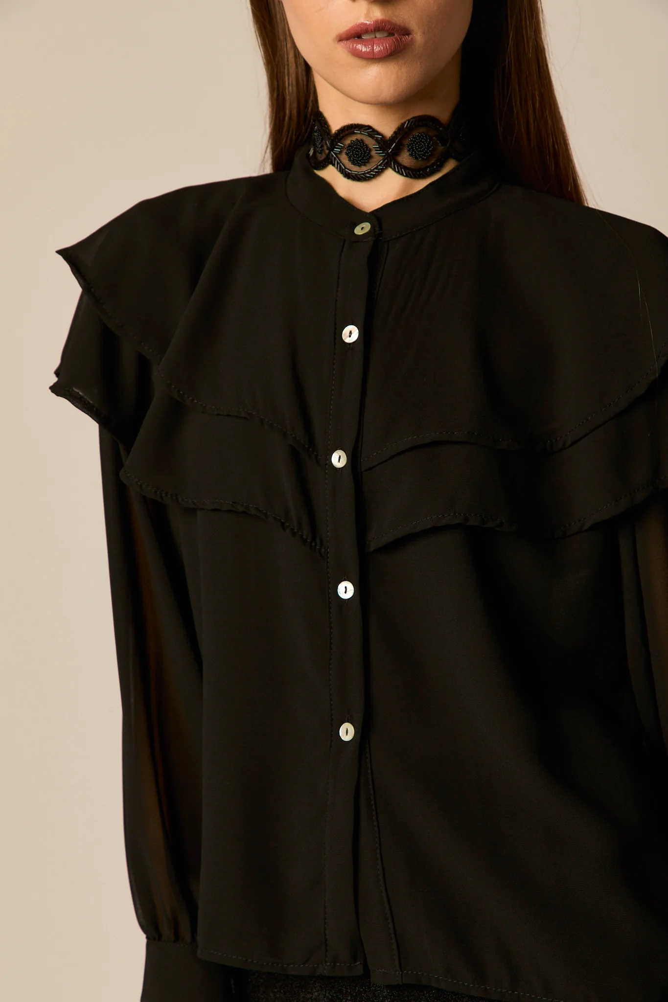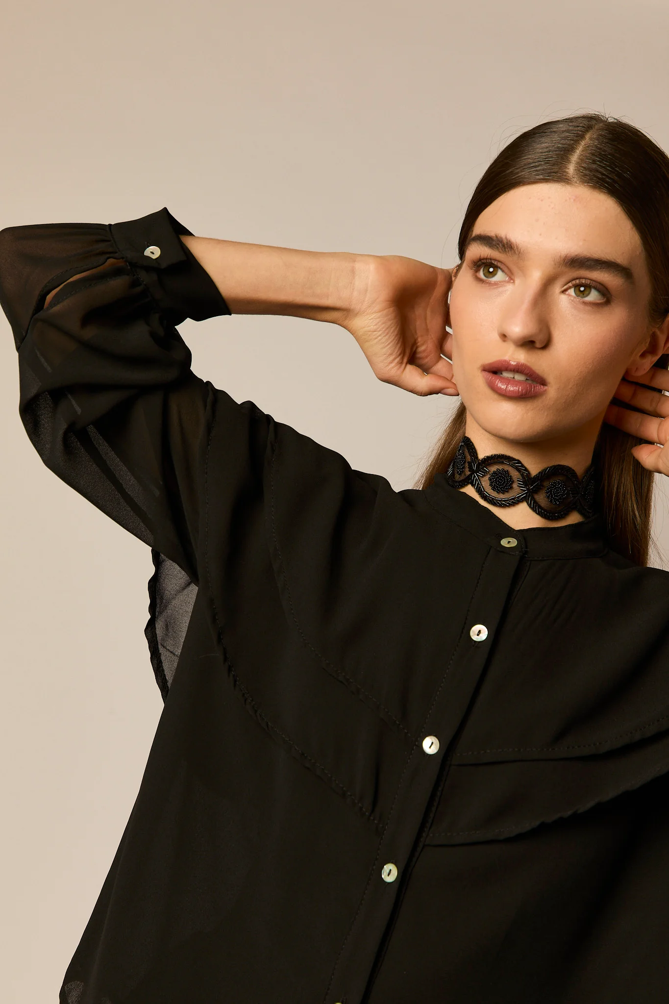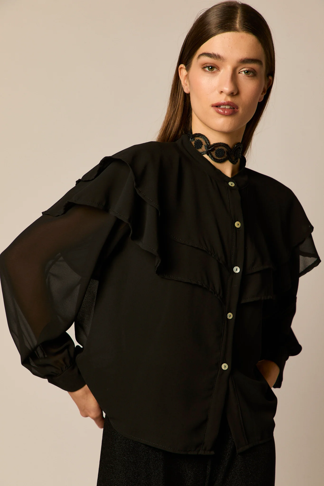 Blusa fluida lisa en color negro. Cuello mao, manga larga abullonada semi transparente, detalle de volantes en el pecho y cierre frontal de botones.