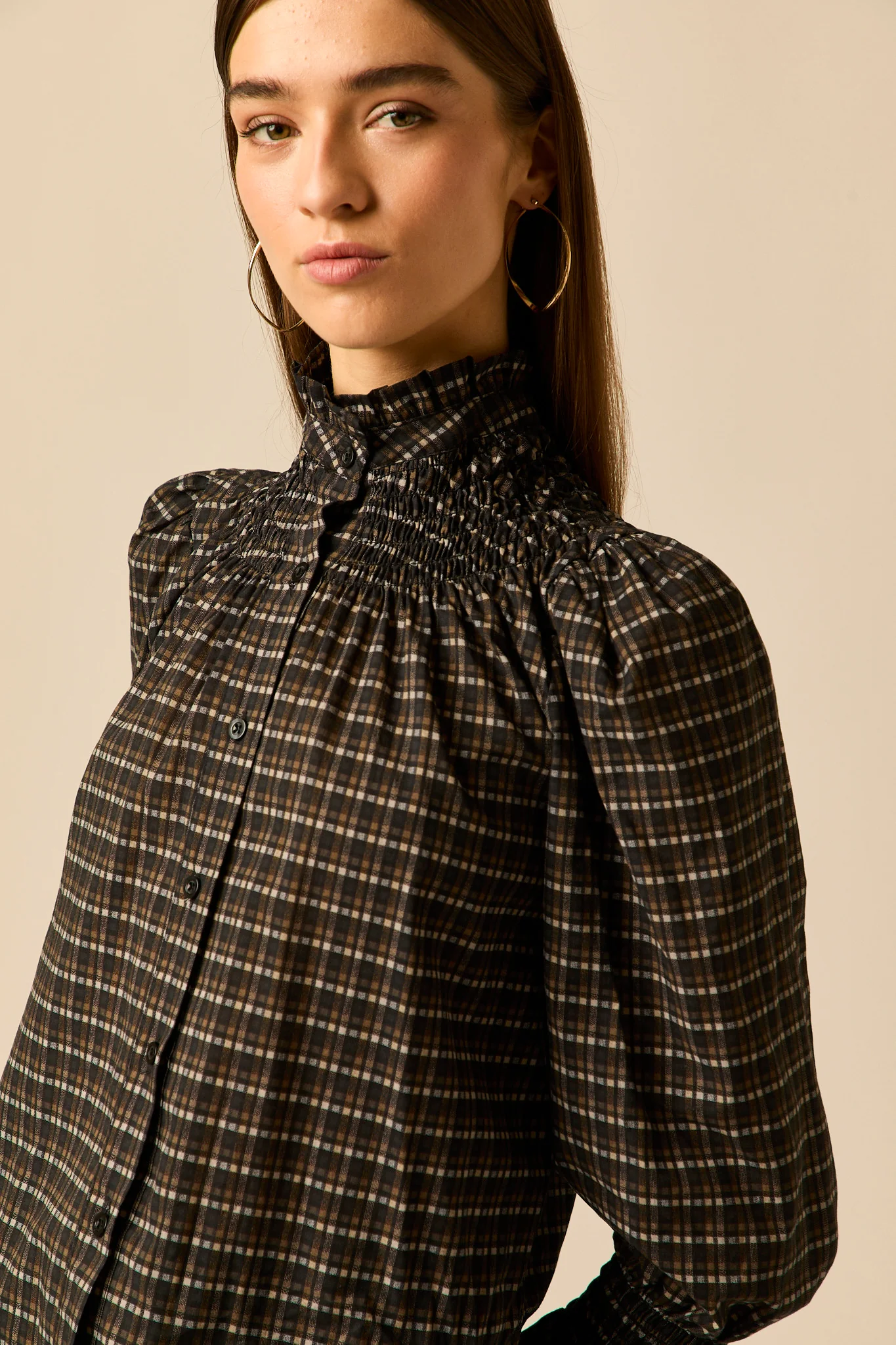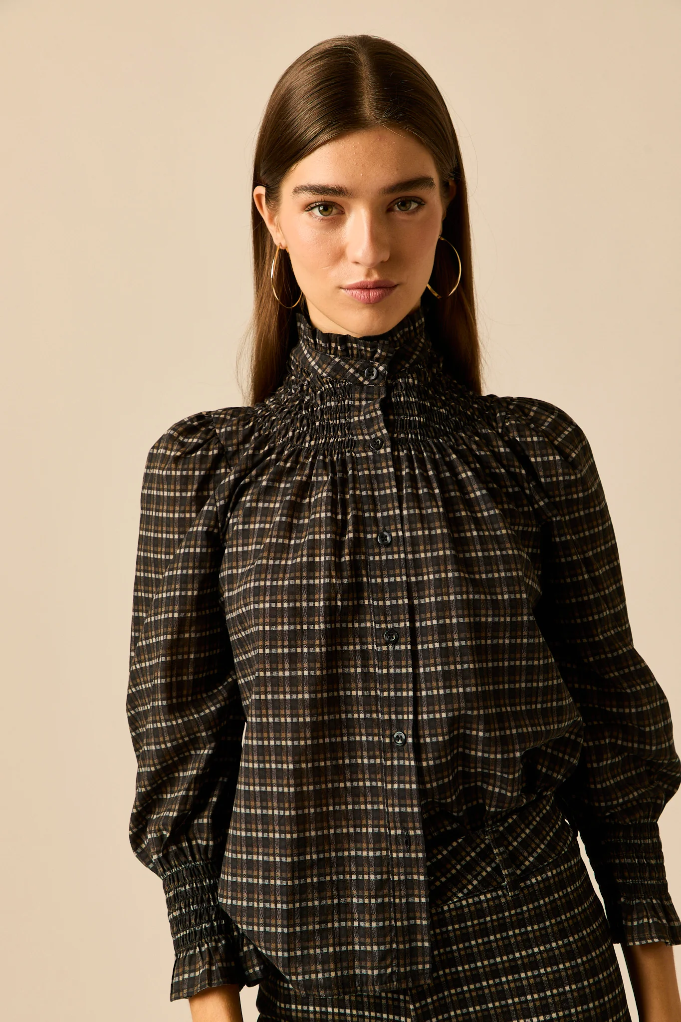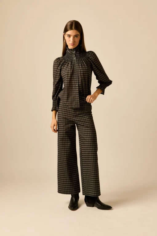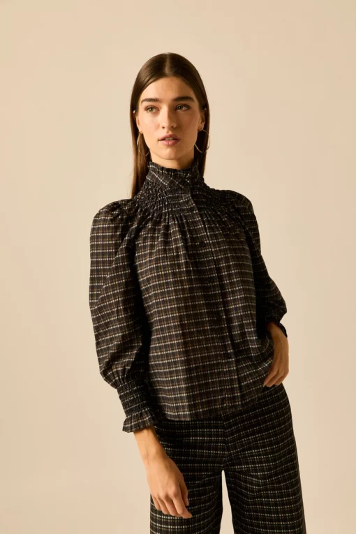 Blusa jacquard de cuadros en tonos gris. Cuello chimenea con detalle de volantes, manga larga abullonada y cierre frontal de botones.
