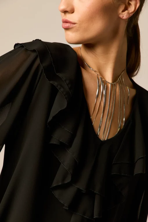 Blusa fluida lisa en color negro. Cuello pico, manga larga abullonada semi transparente, y detalle de volantes en el pecho.