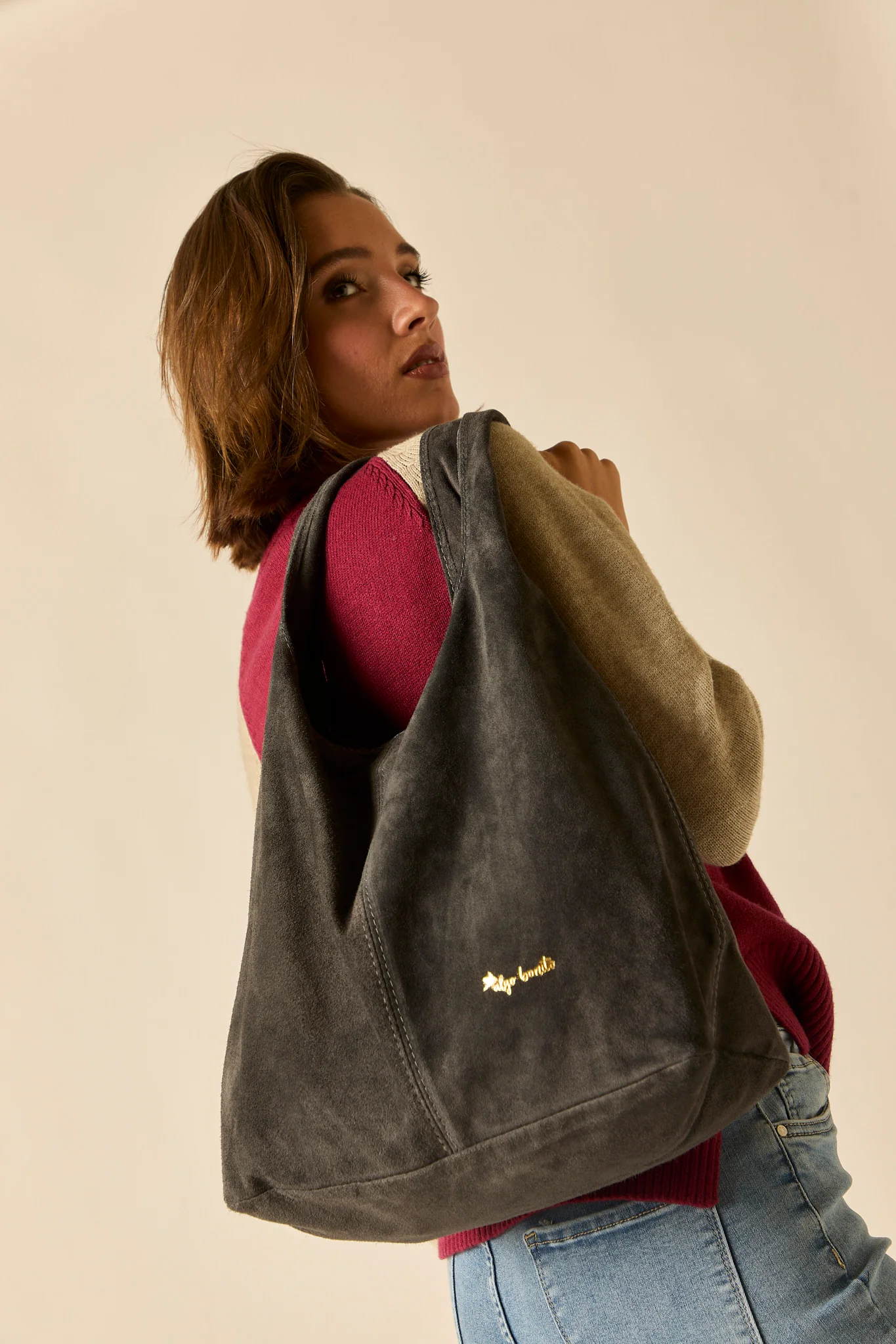 Bolsa de ante grande en color gris antracita. Diseño ancho, bolsillo interior y cierre de cremallera. Medidas: 43 cm de ancho x 32 cm de alto.