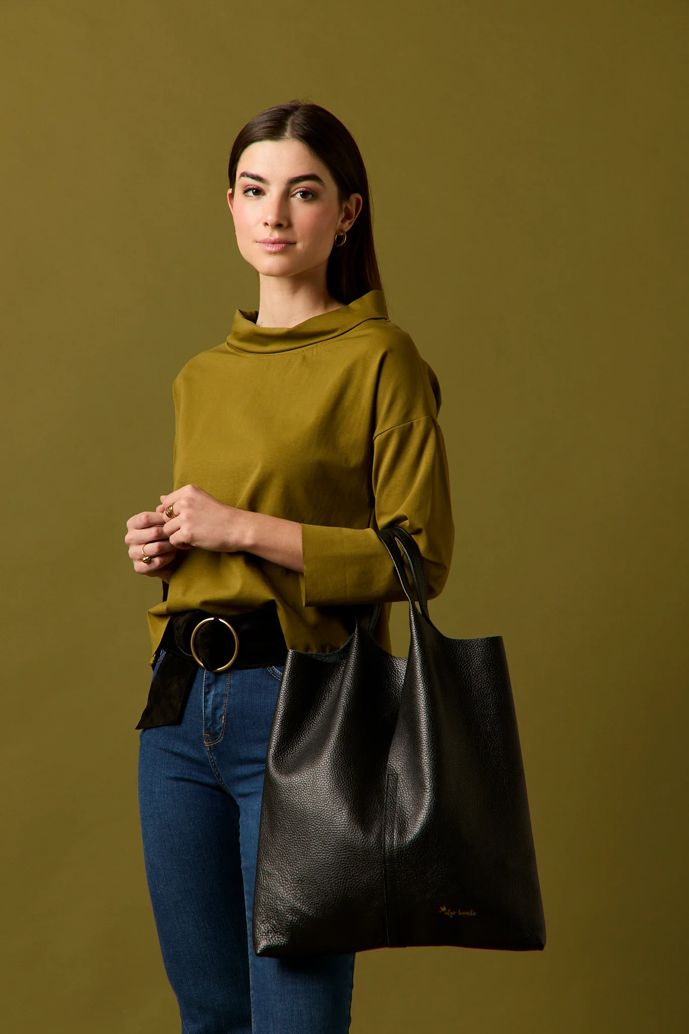 Bolso de piel en color negro. Diseño amplio, asas cortas y aberturas centrales.