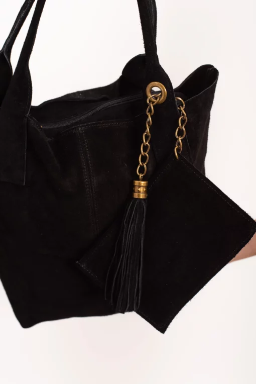 Bolso de piel (serraje). Doble asa. Cierre cremallera. Bolsillo adicional con cierre cremallera. Detalle de pompon.