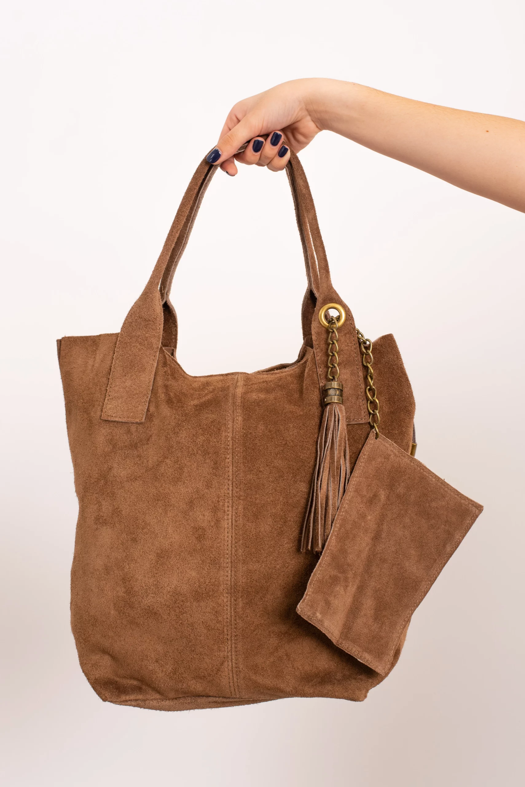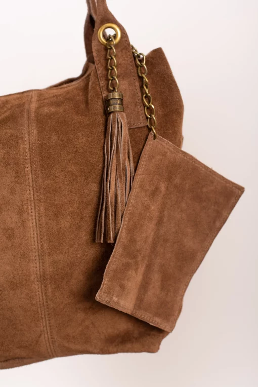 Bolso de piel (serraje). Doble asa. Cierre cremallera. Bolsillo adicional con cierre cremallera. Detalle de pompon.