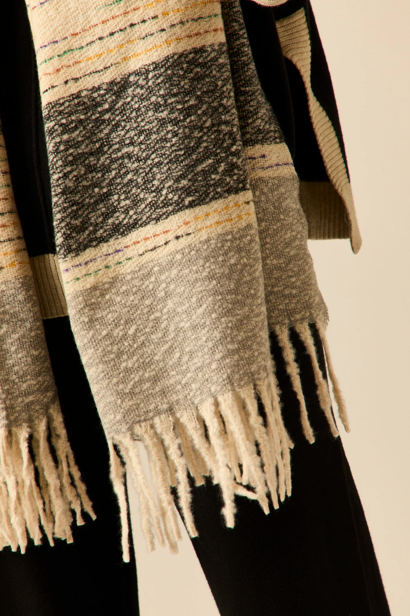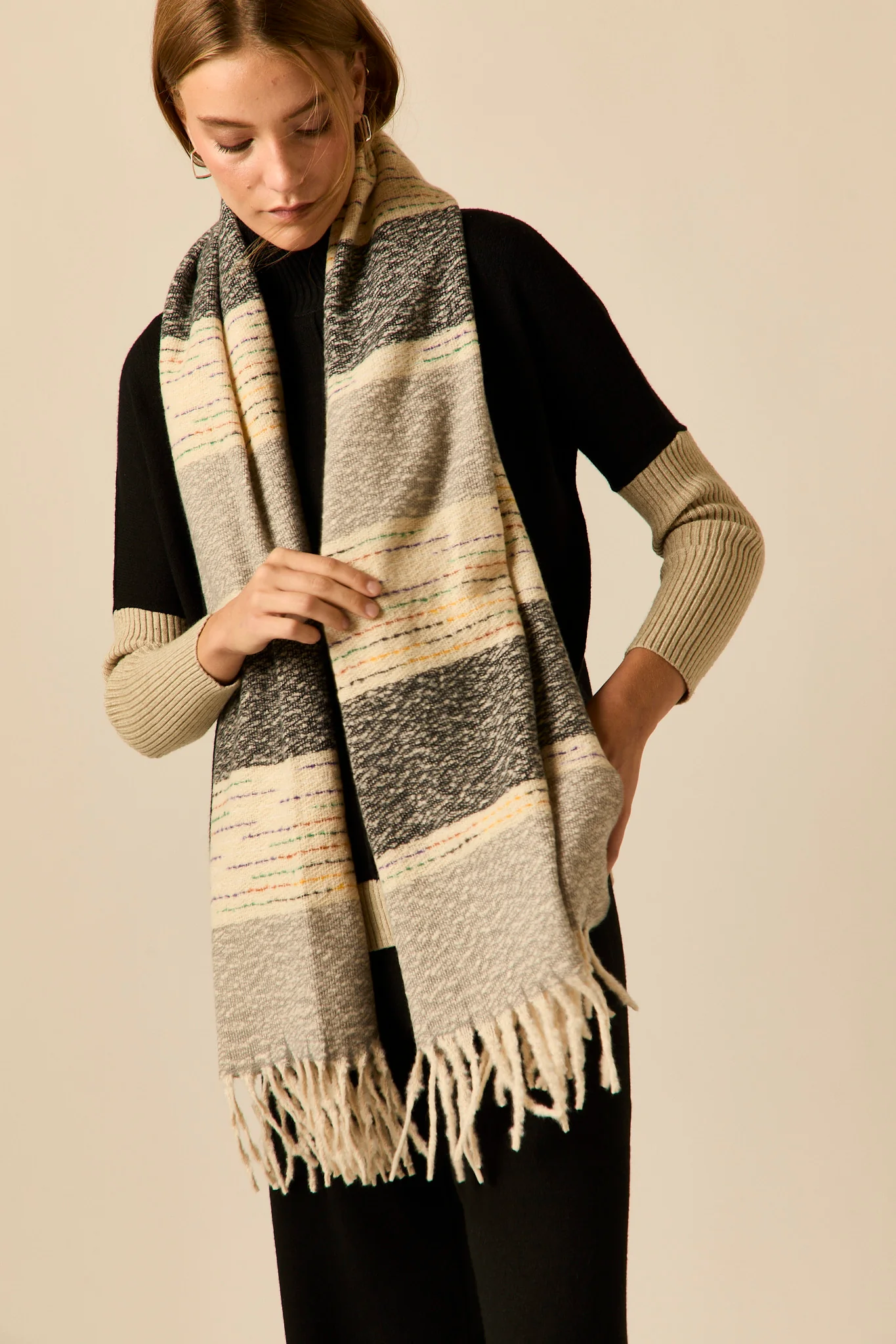 Bufanda estilo manta multicolor en tonos gris y beige con acabado en flecos.