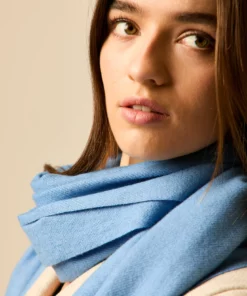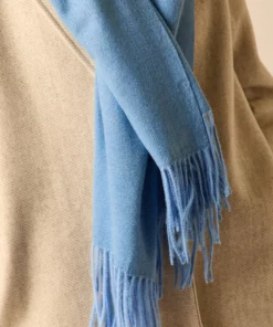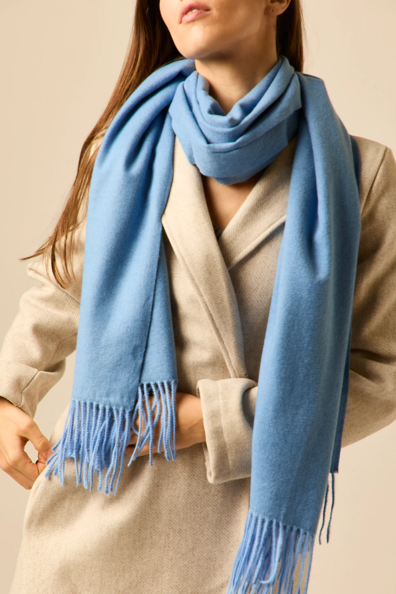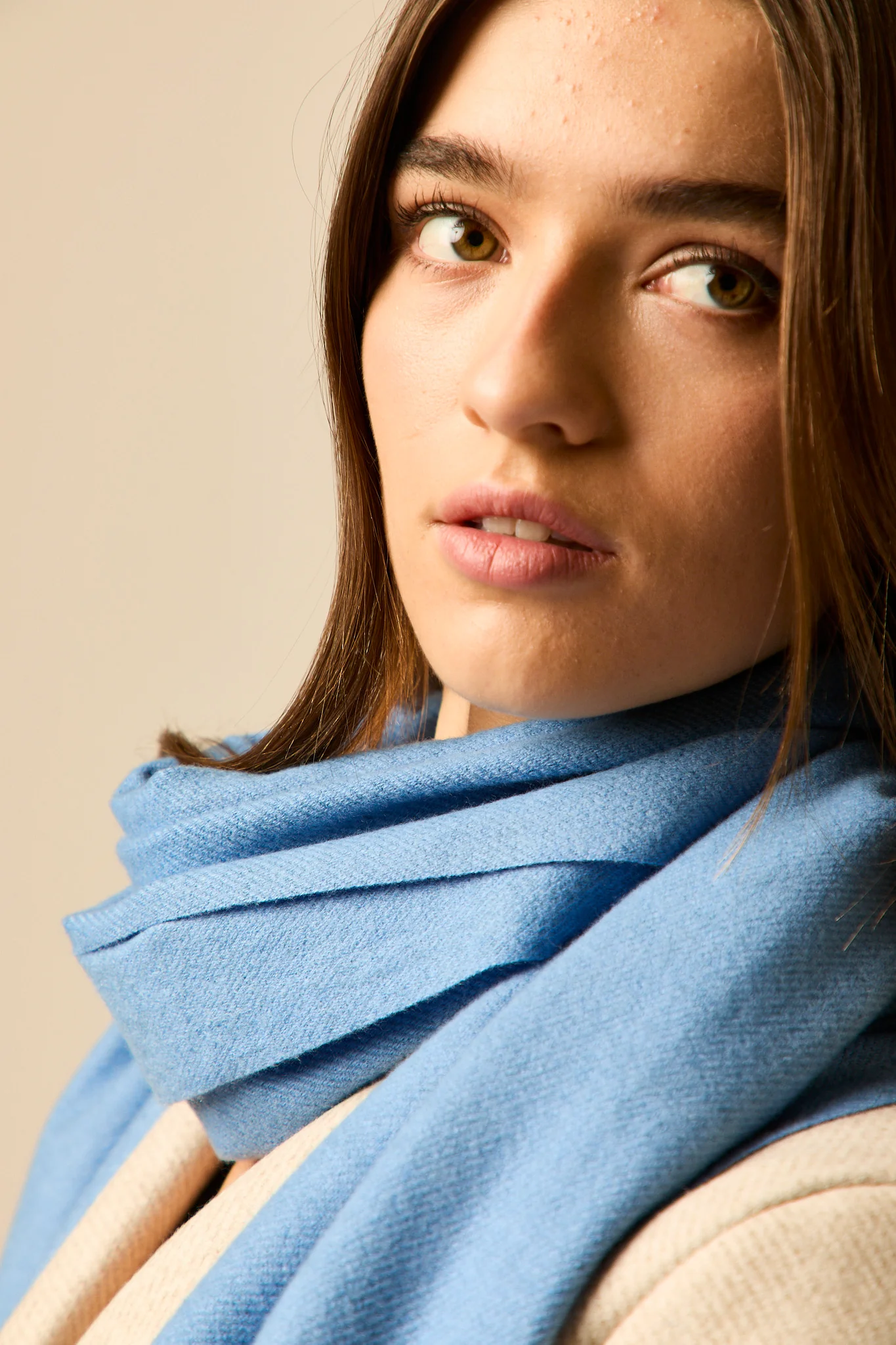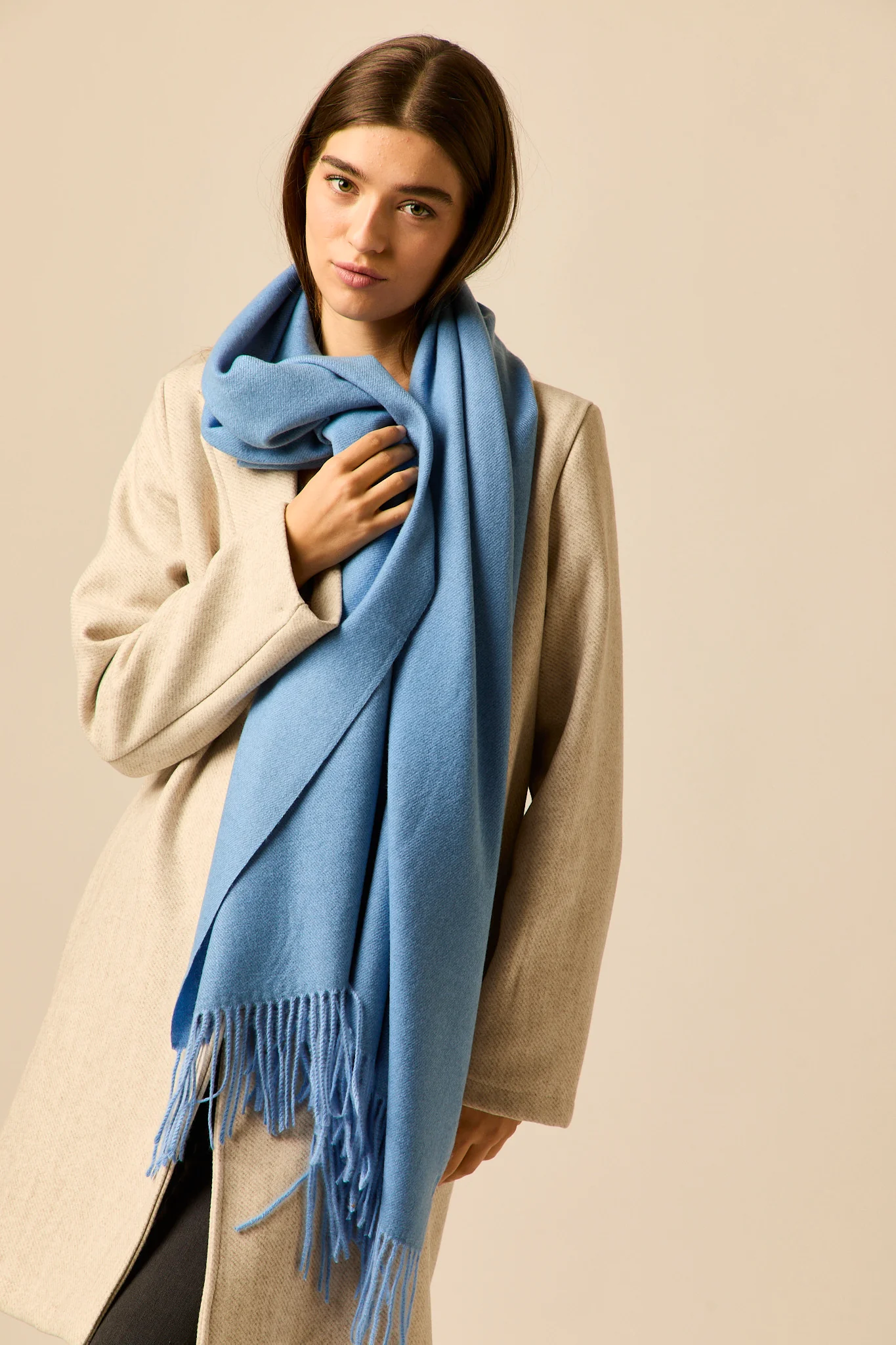 Bufanda estilo manta lisa de color azul celeste con acabados en flecos en ambos extremos.