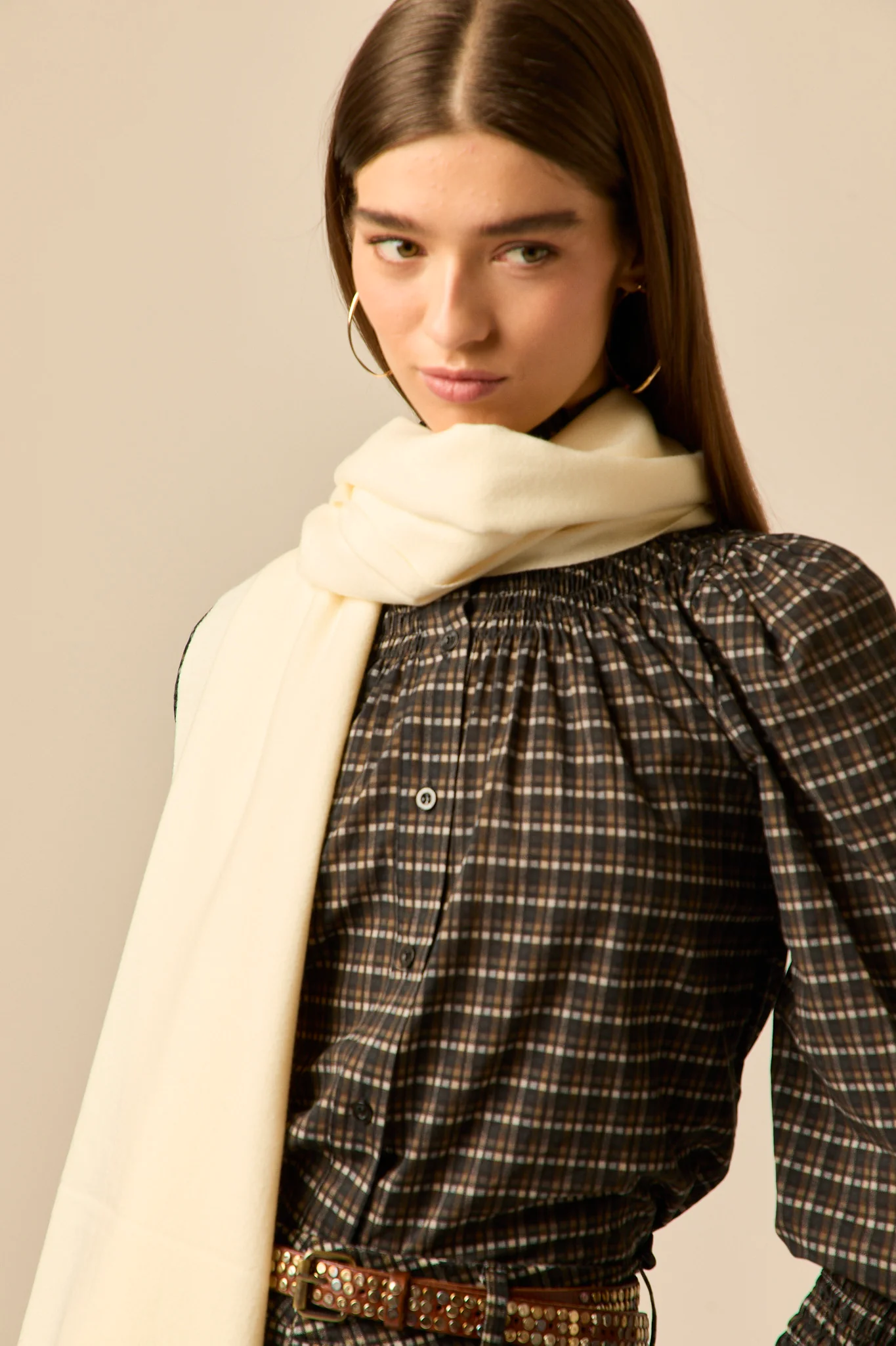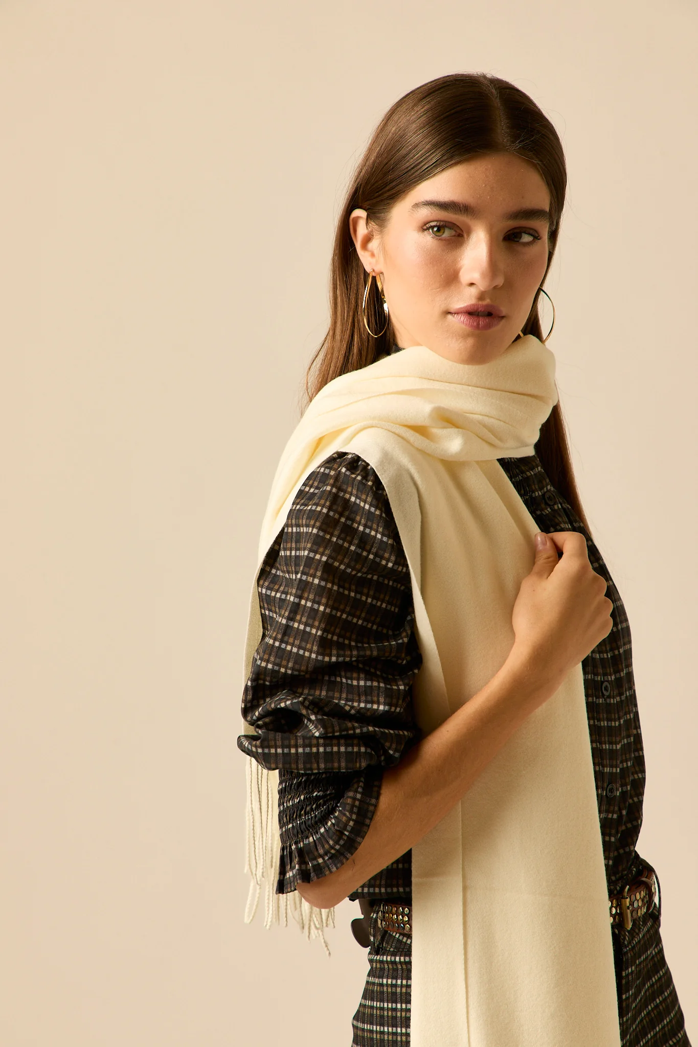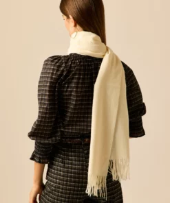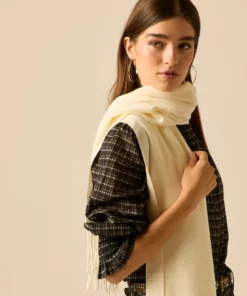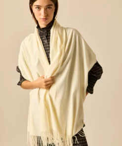 Bufanda estilo manta lisa de color crema con acabados en flecos en ambos extremos.