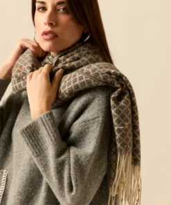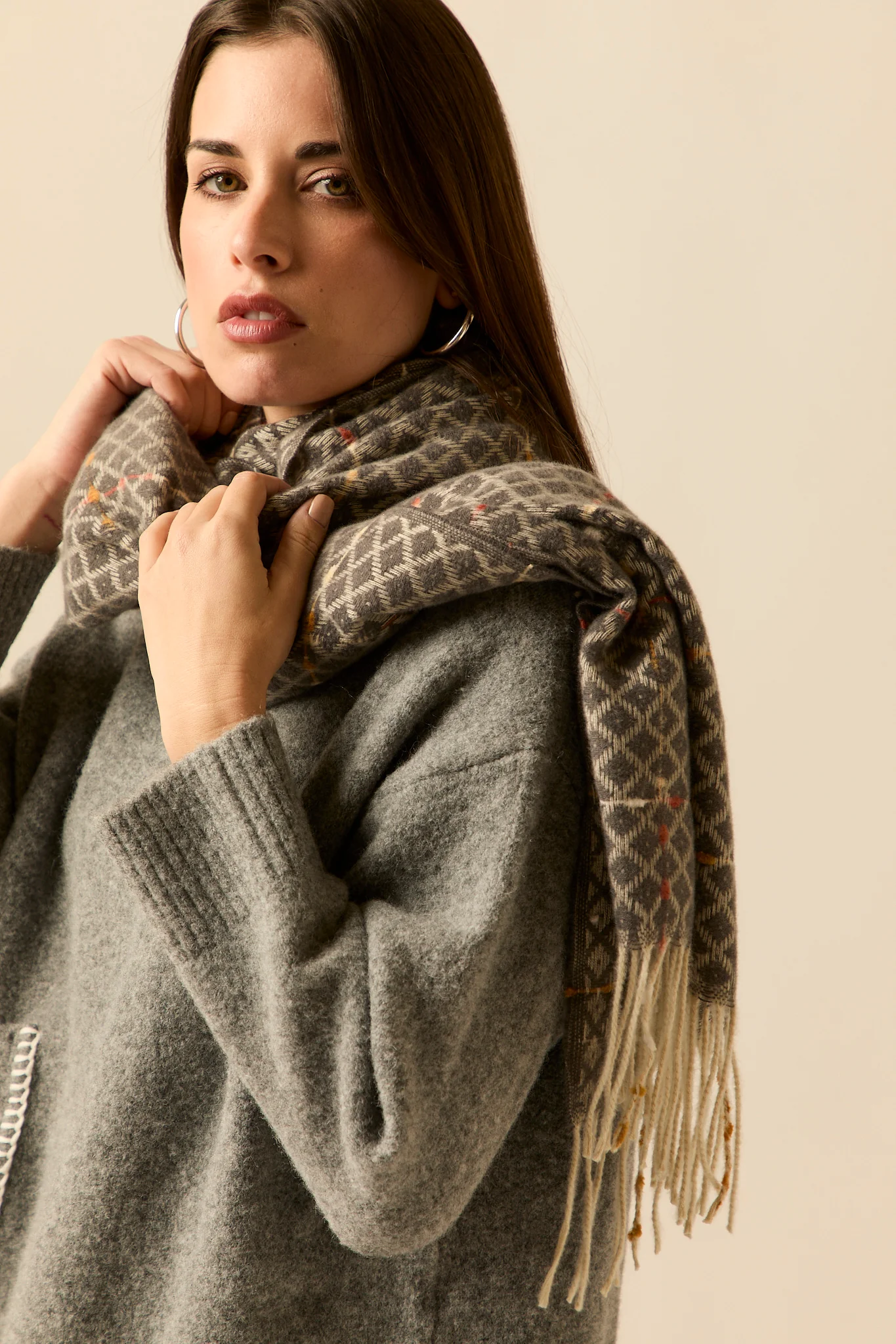 Bufanda de estampado de rombos en tonos gris, blanco y mostaza. Diseño amplio, detalle de flecos en los extremos y tacto suave.