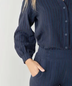 Camisa realizado en un tejido flocado, en color azul con raya en tono marrón.