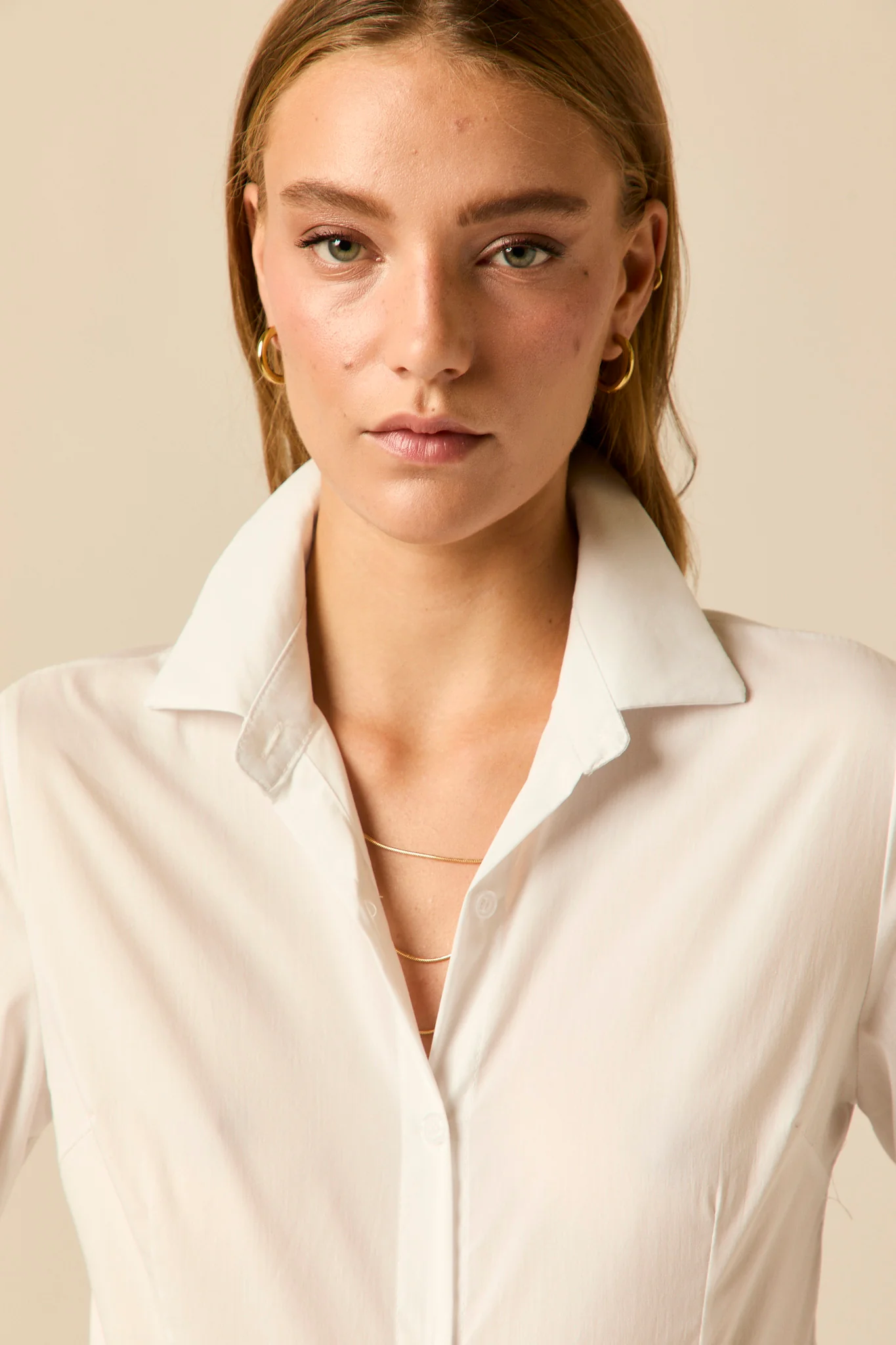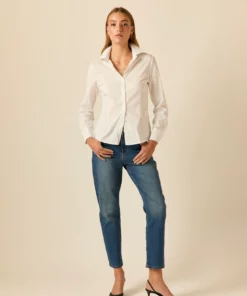 Camisa básica de diseño entallado en color blanco. Cuello de solapa, manga larga ajustable con botón y cierre frontal de botones.
