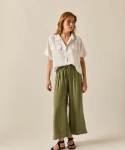 Camisa cropped en color blanco. Cuello de solapa, manga 3/4 ancha, diseño fluido, cierre frontal de botones y detalle de falsos bolsillos frontales.