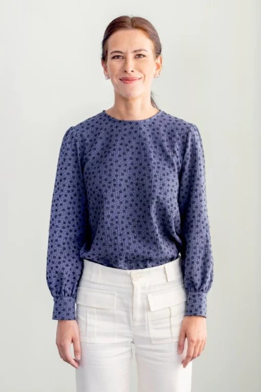 Camisa realizada en tejido flocado de algodón en tonos azules.