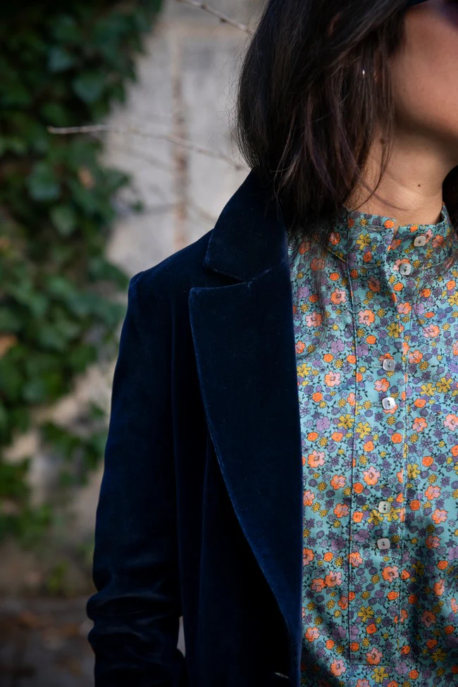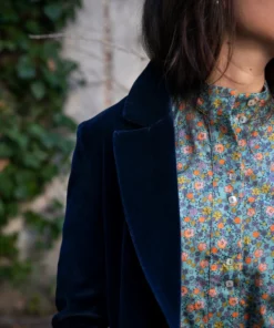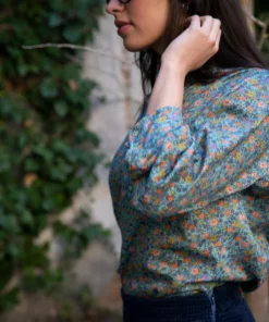 Camisa de flor liberty en tonos azul, coral y malvas, realizado en un tejido fino de algodón suave, muy favorecedora.