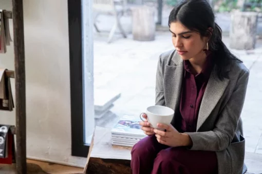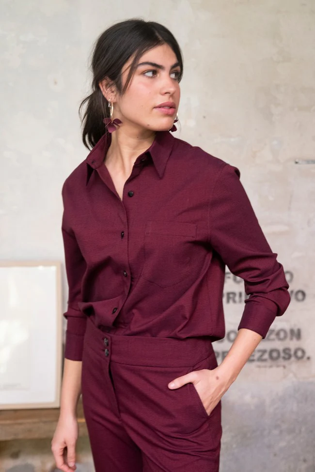 Camisa en color burdeos, con un pequeño dibujo pata de gallo muy discreto pero que da a la prenda un toque de originalidad, realizado en un tejido de mezcla consiguiendo que se adapte perfectamente al cuerpo.