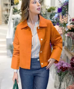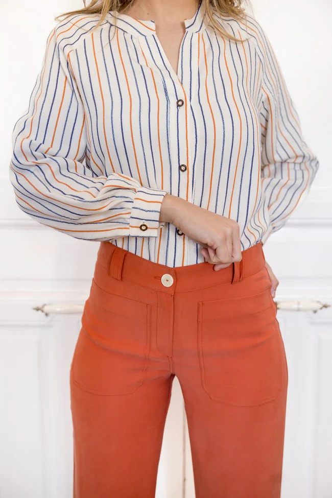 Camisa realizada en un tejido de algodon en rayas ocre y azul.