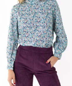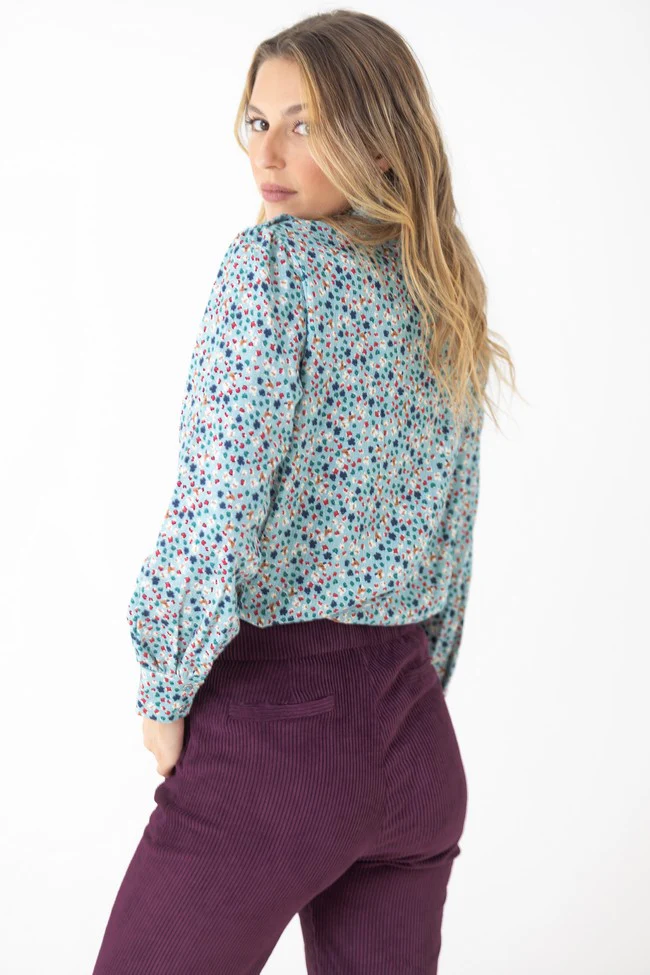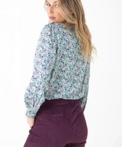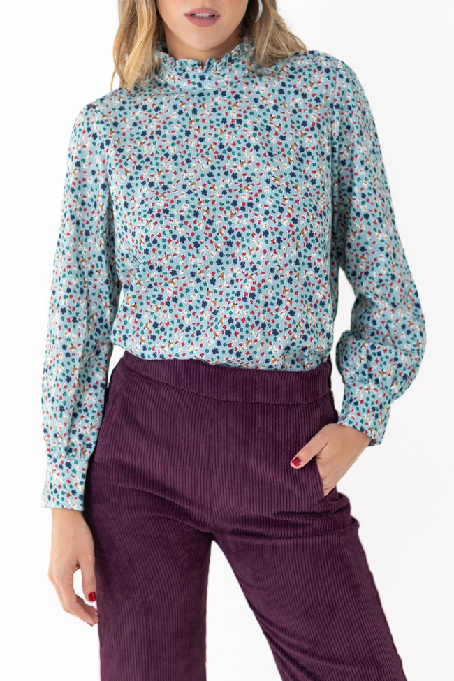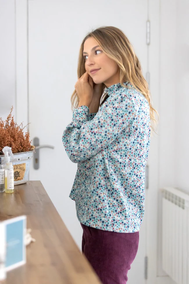 Camisa realizado en un tejido de algodón y viscosa sobre un estampado turquesa.