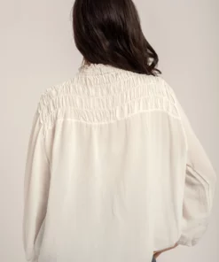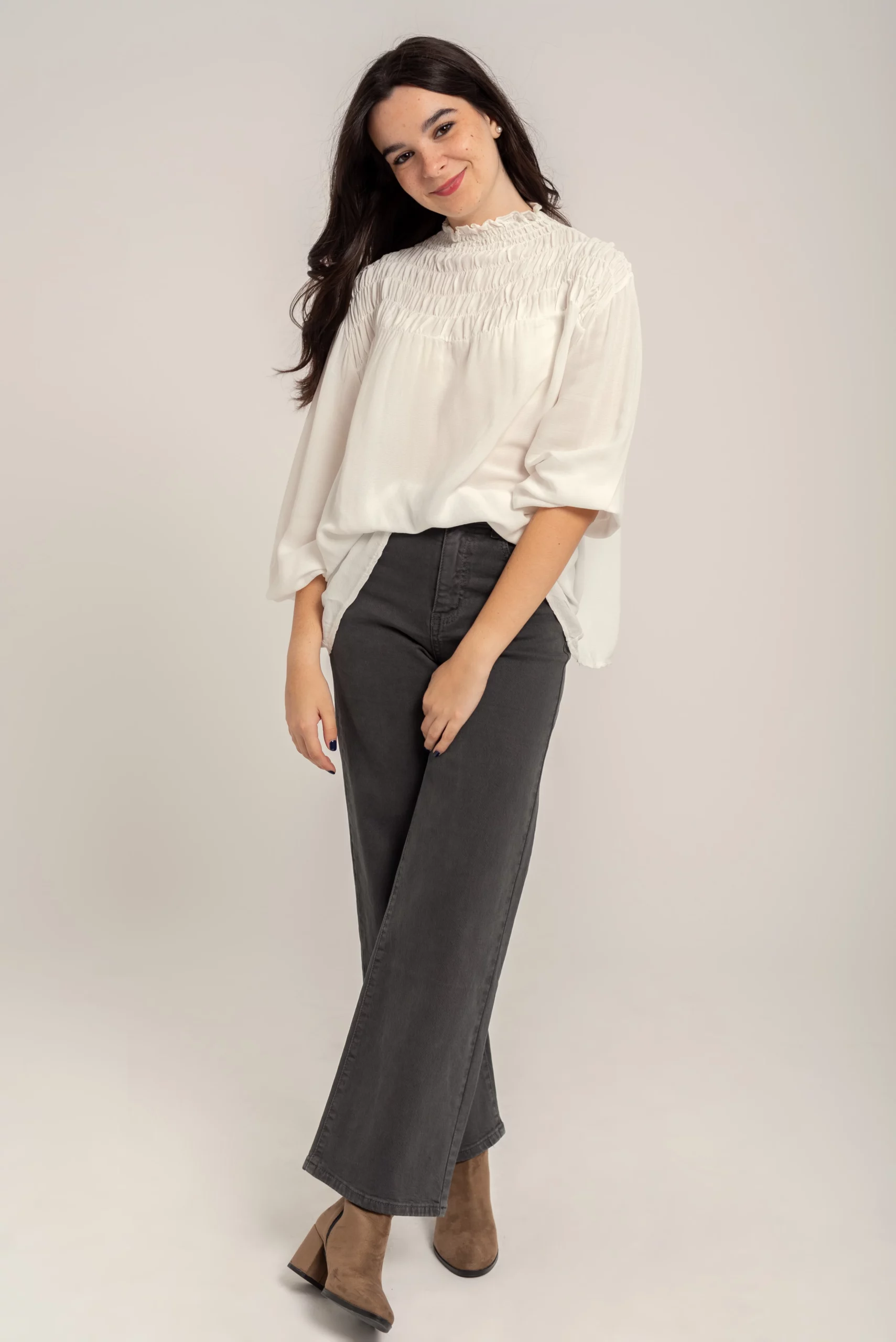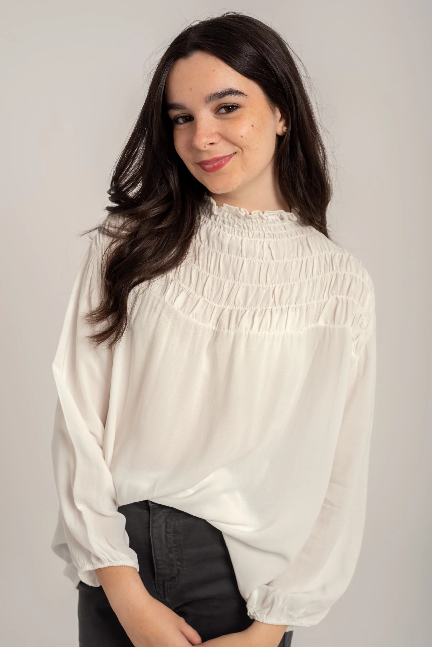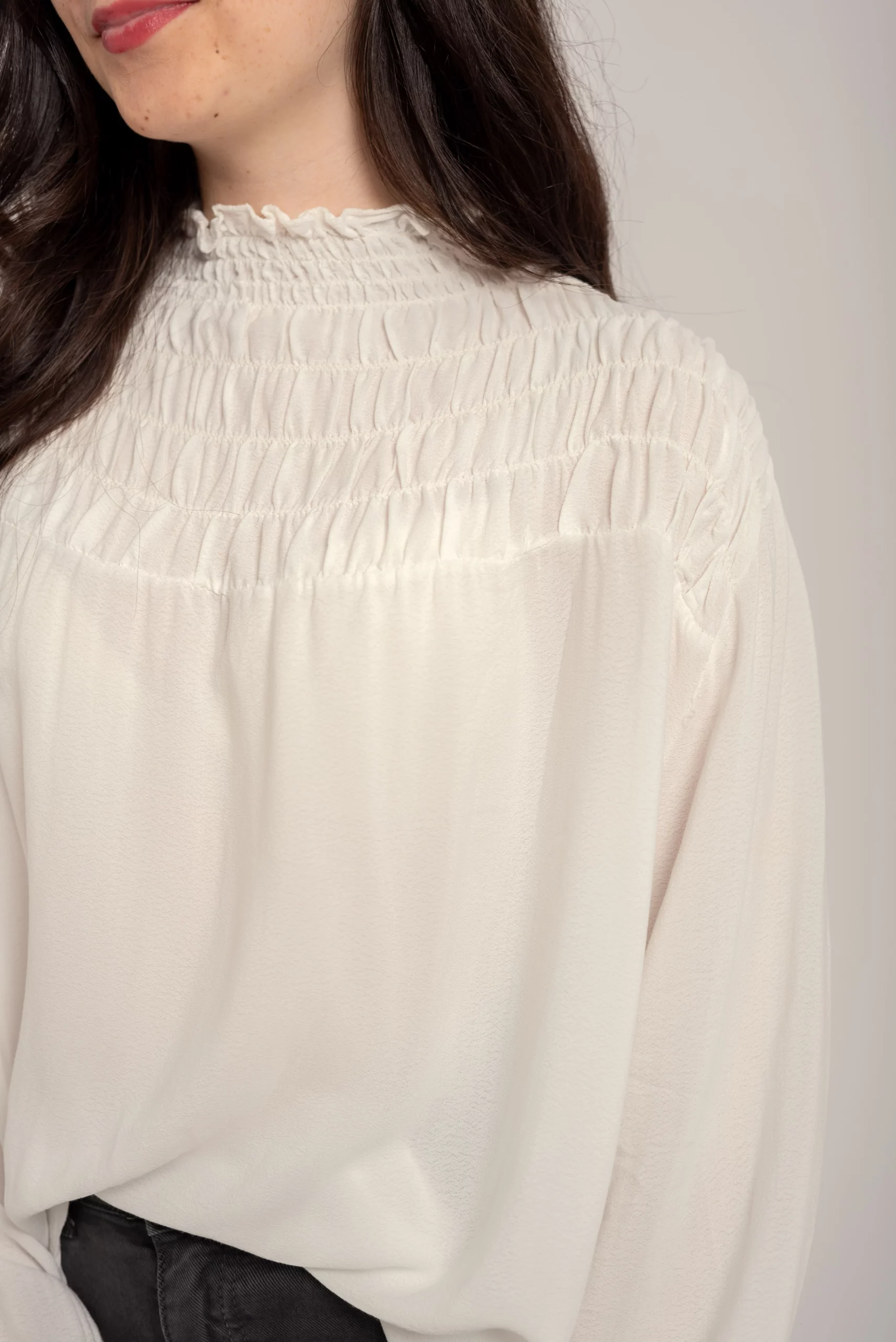 Blusa crepe con goma del pecho al cuello chimenea. Manga francesa con goma en el puño. Corte fluido. Un básico perfecto para toda la temporada.