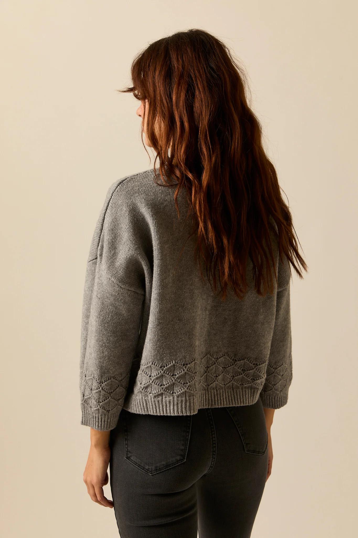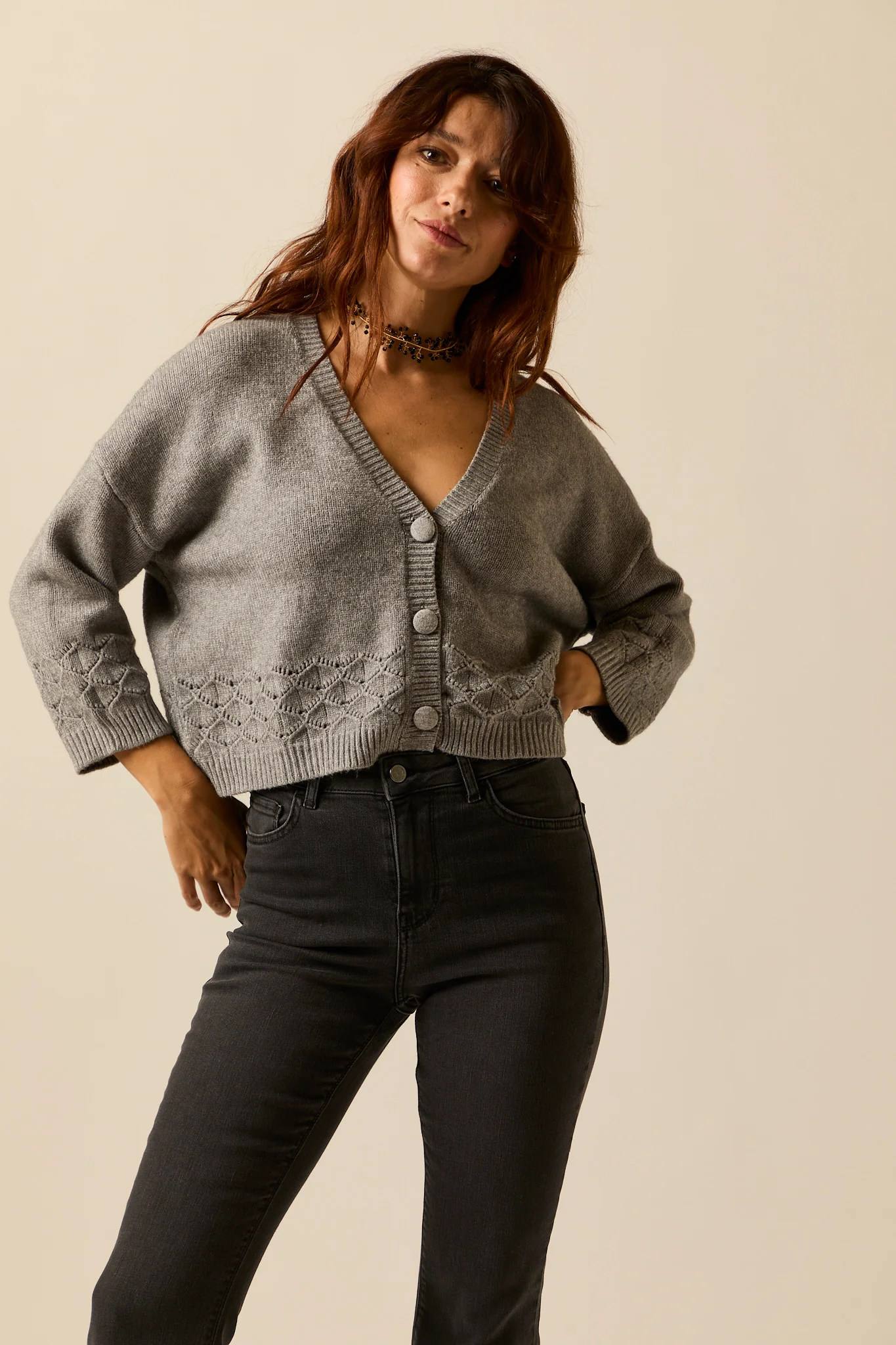 Cárdigan estilo corto en color gris. Cuello pico, manga larga con acabados en rib, detalles de cenefa calada y cierre frontal de botones.