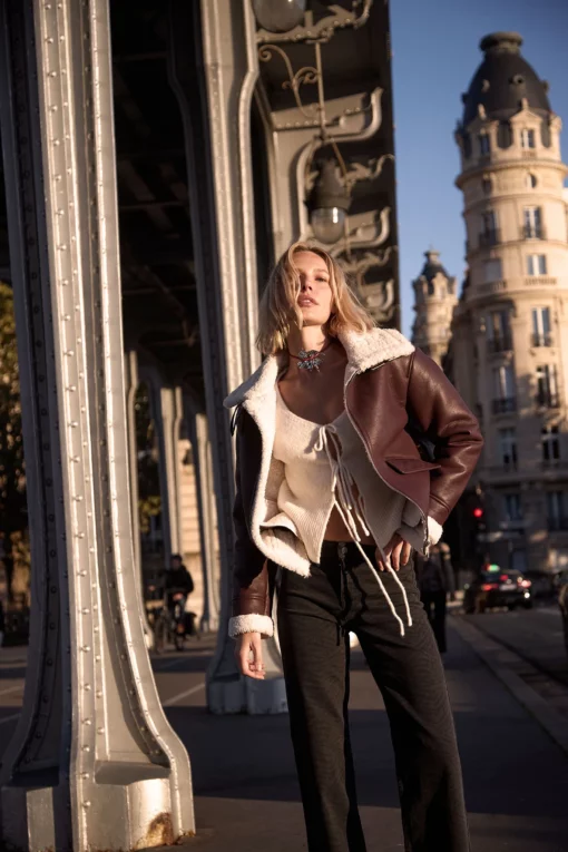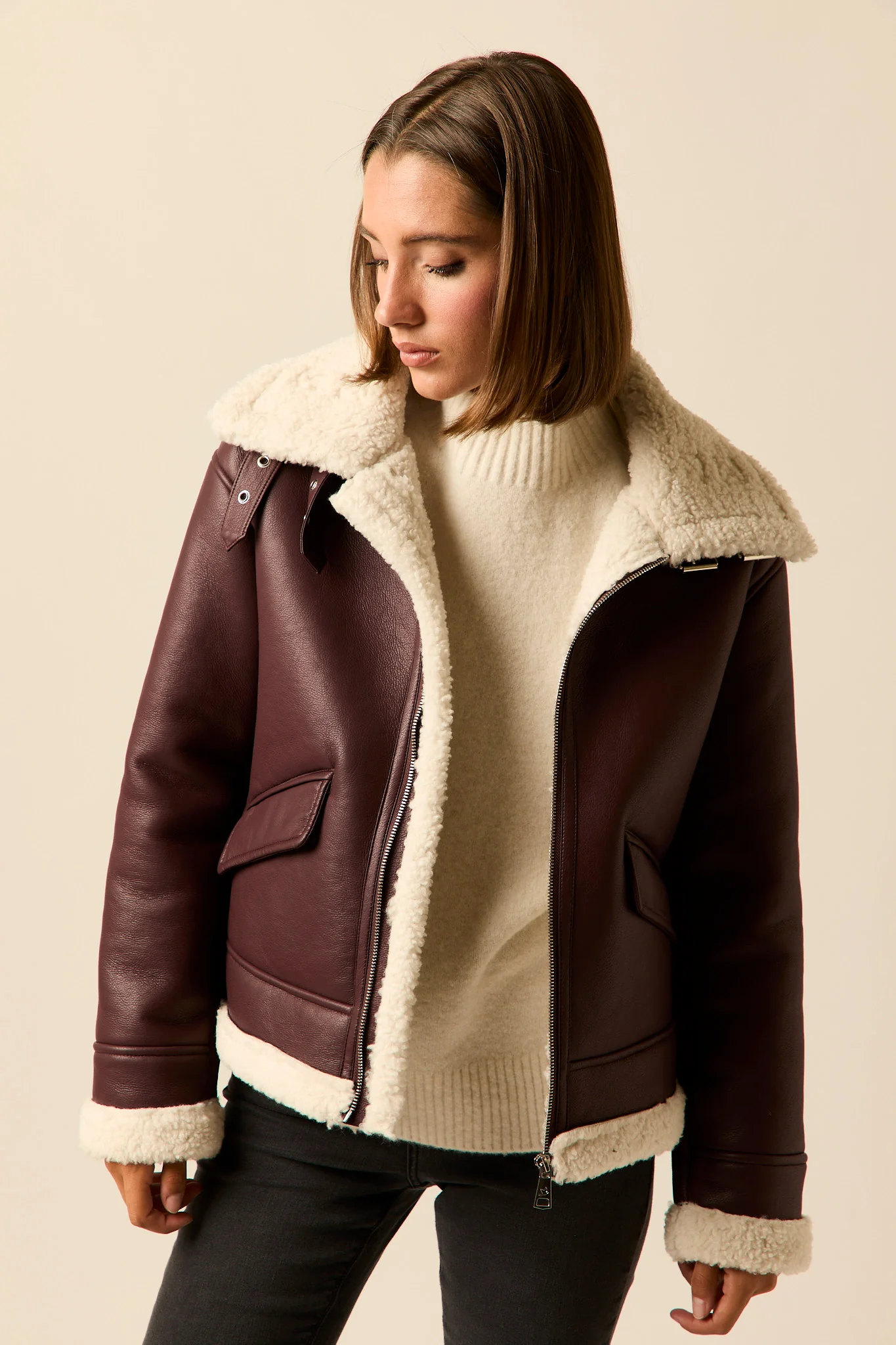 Cazadora de cuello solapa en color granate. Manga larga, bolsillos delanteros, forro interior y acabados con tejido combinado en borreguillo. Detalle de cierre de hebilla en el cuello y cierre frontal con cremallera.
