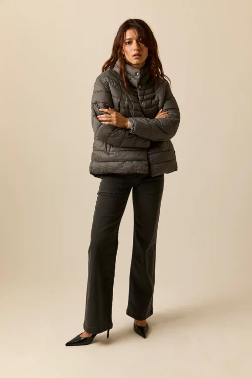 Abrigo de plumas en color gris antracita. Cuello caja, manga larga, cierre frontal de botones y dos bolsillos laterales.