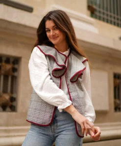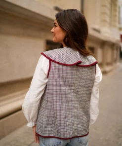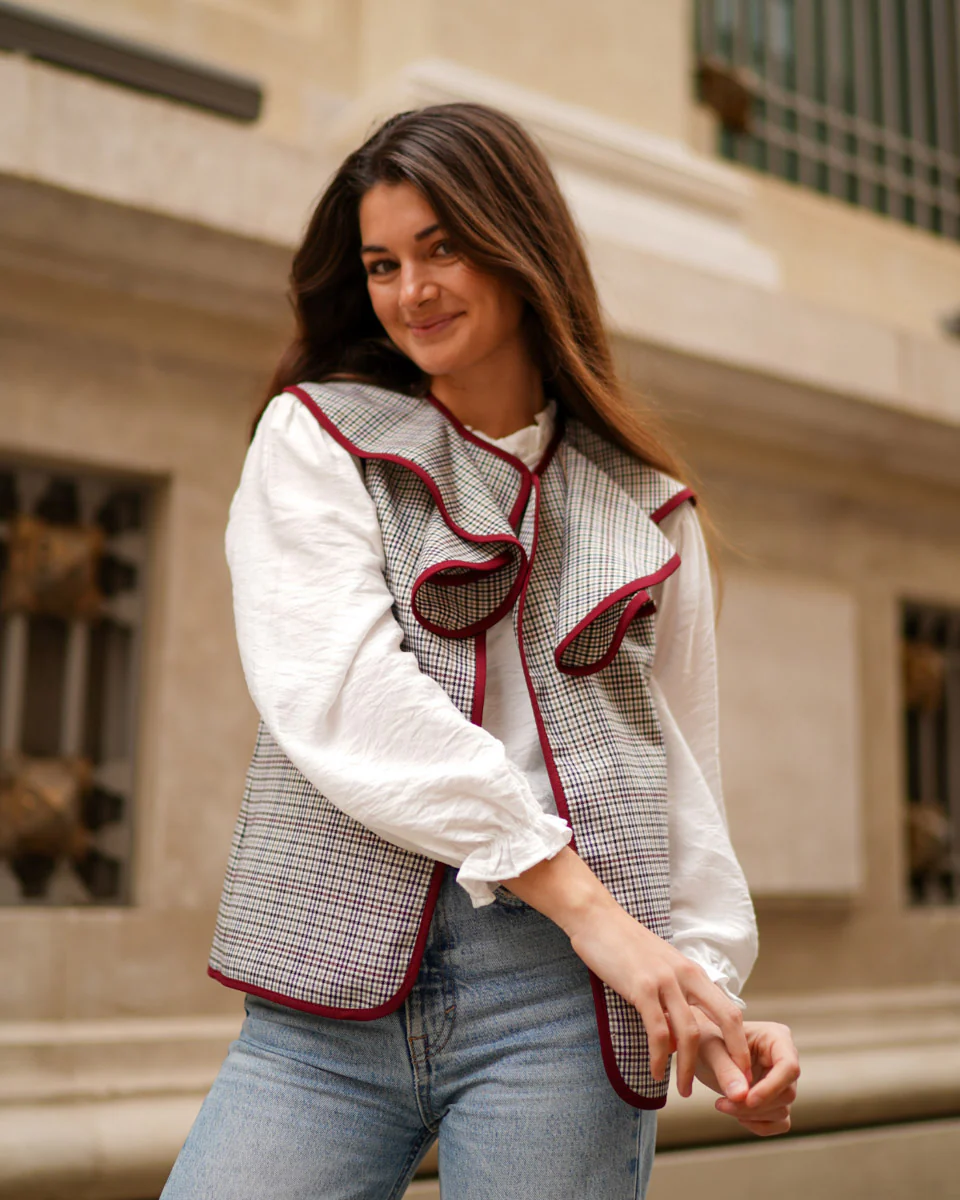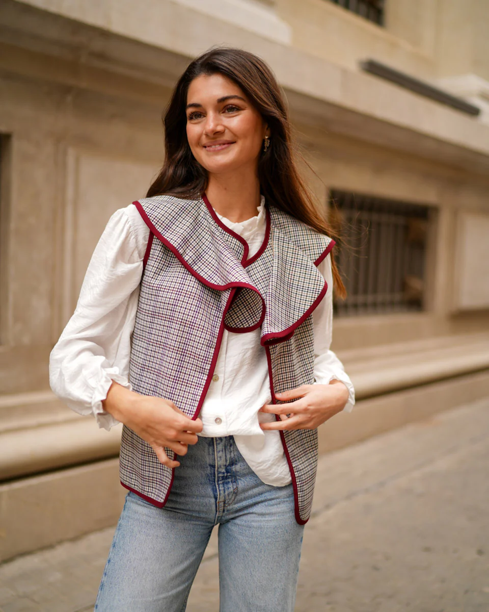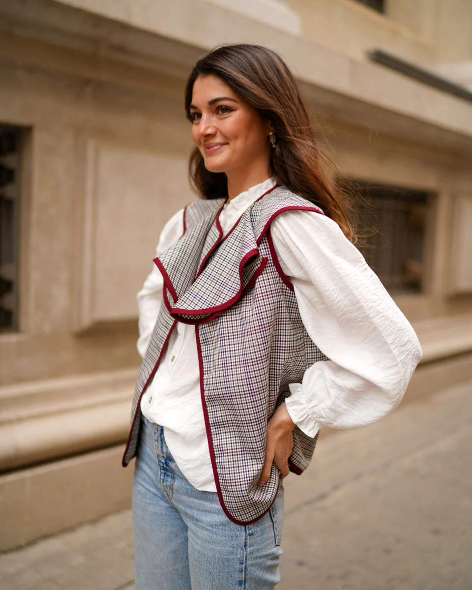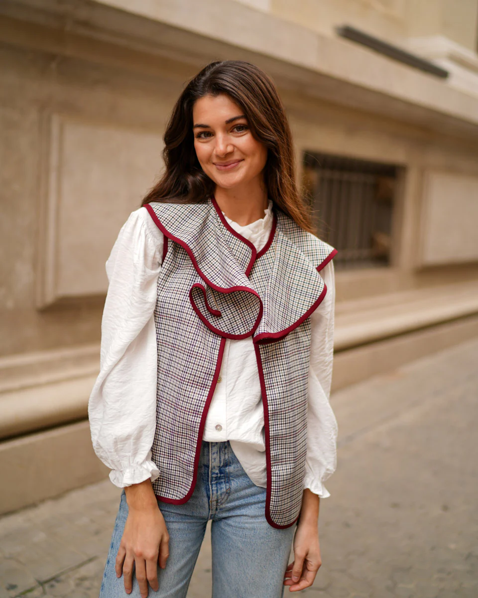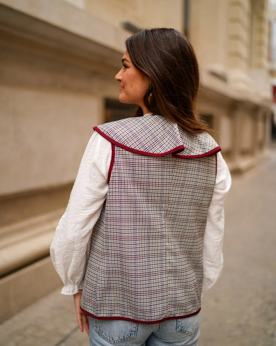 - Chaleco de pata de gallo abierto con bordes haciendo contraste.