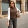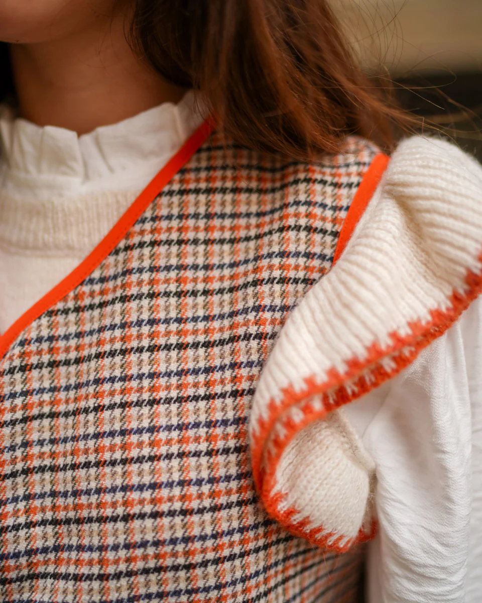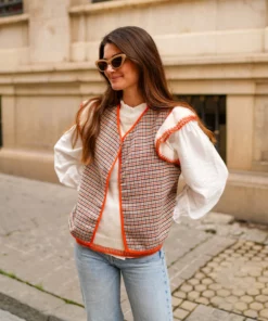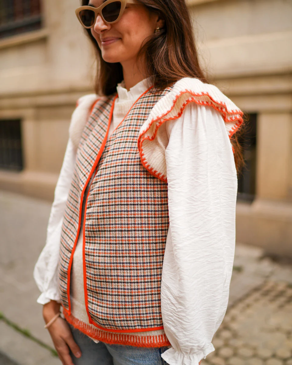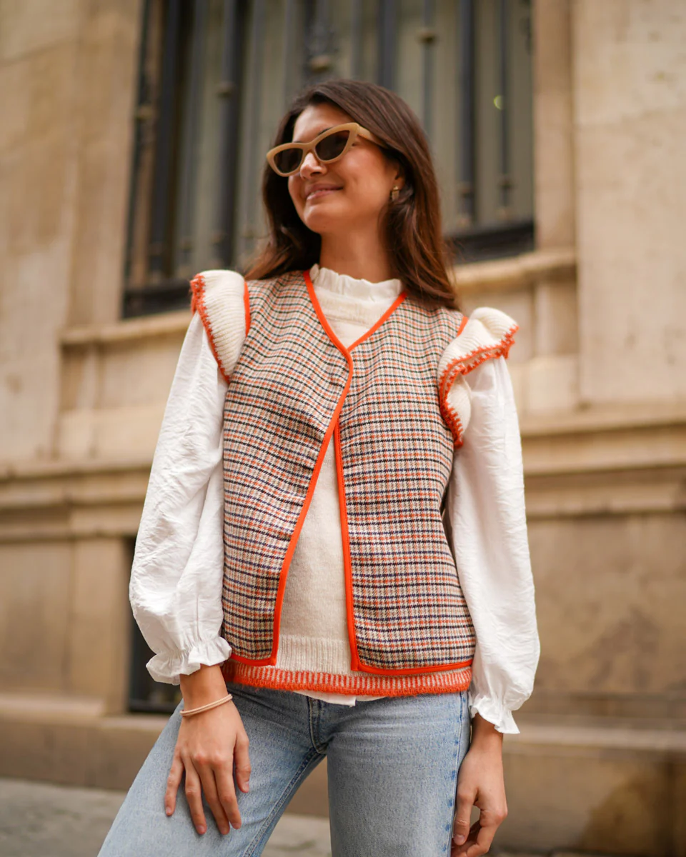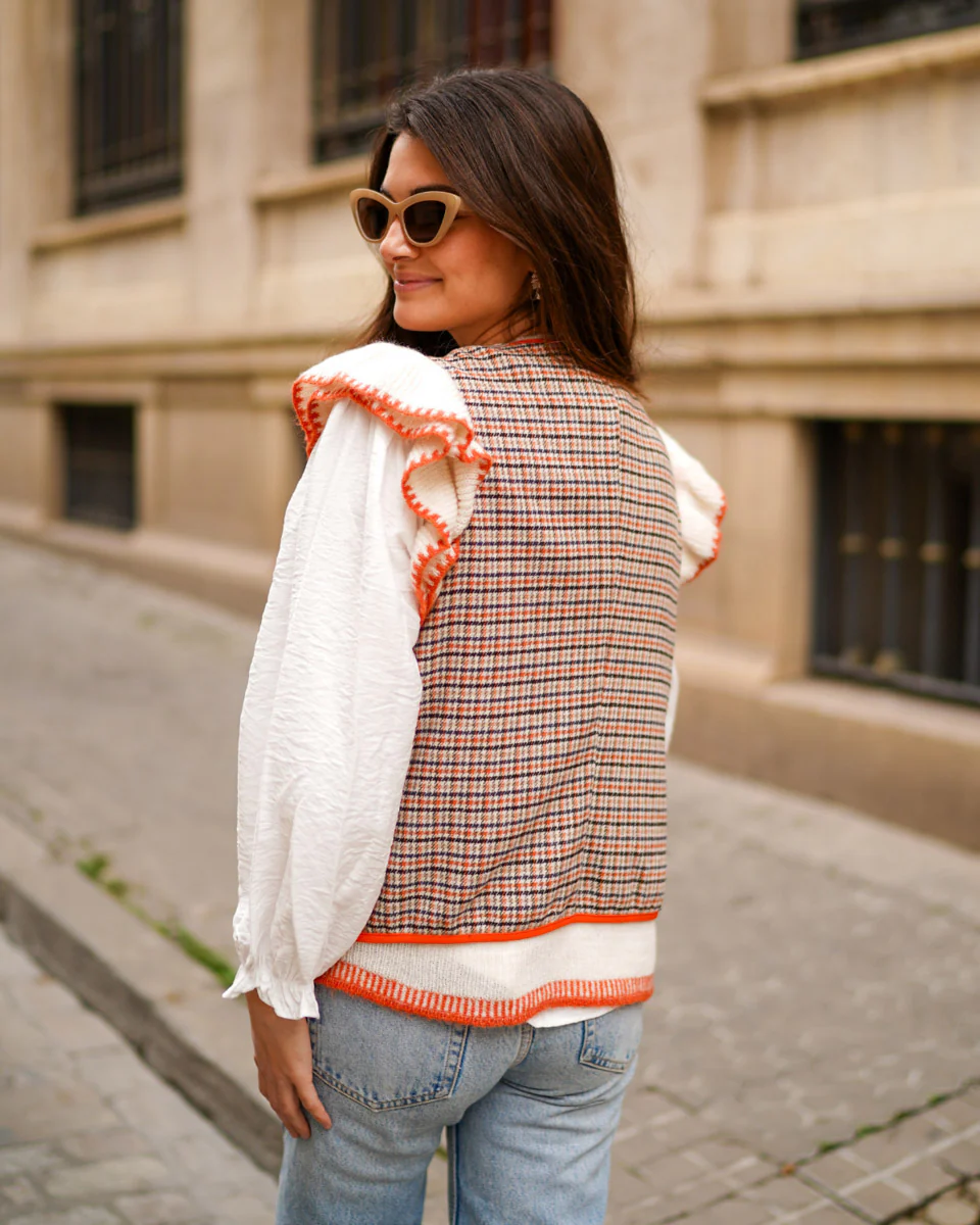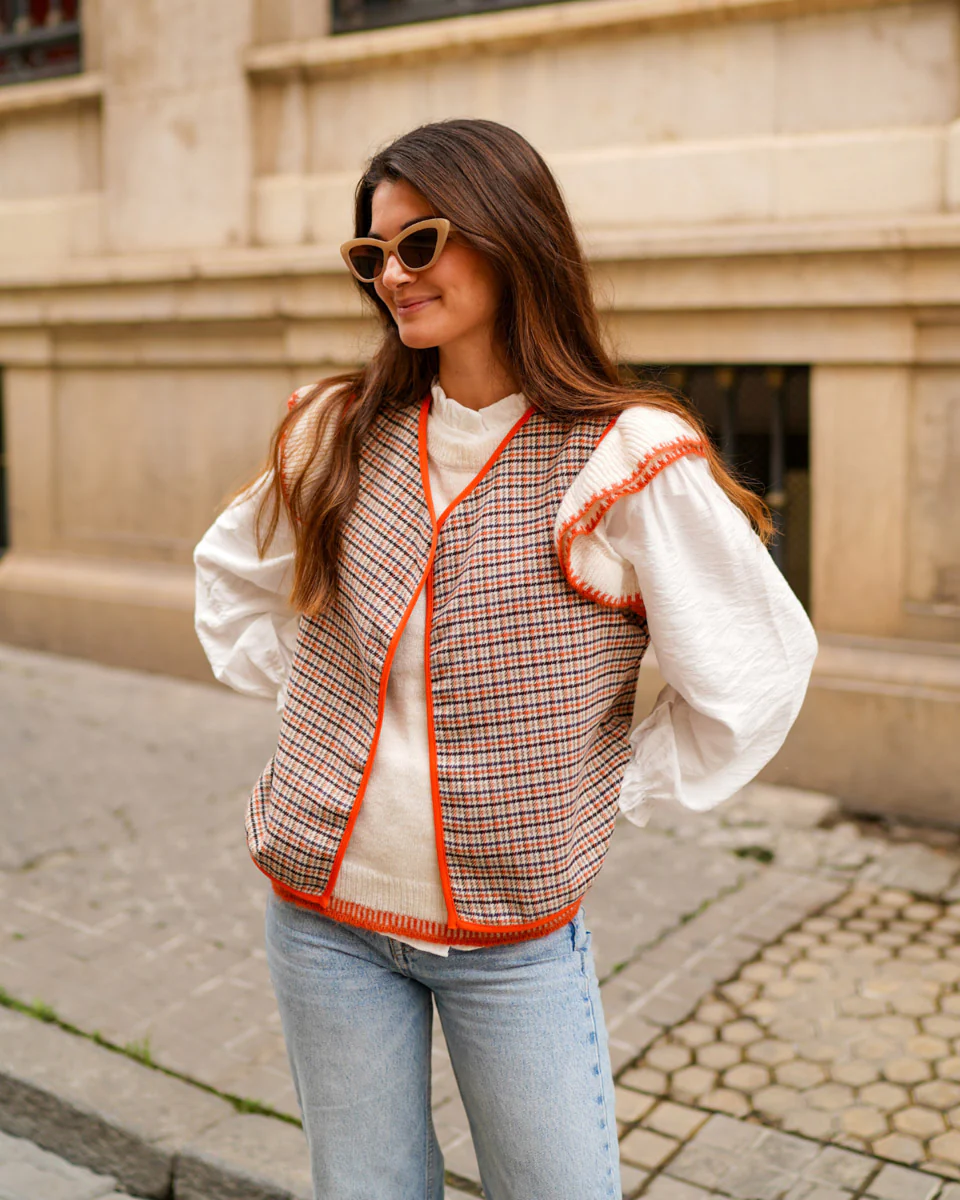 - Chaleco de pata de gallo abierto con bordes haciendo contraste.
