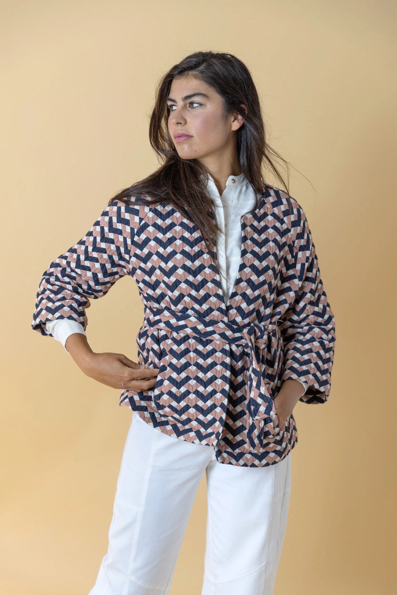 Chaqueta realizada en un tejido acolchado de algodón con mezcla, de corte recto y largura media, con dibujo asimétrico en color crudo, azul y rosa palo.