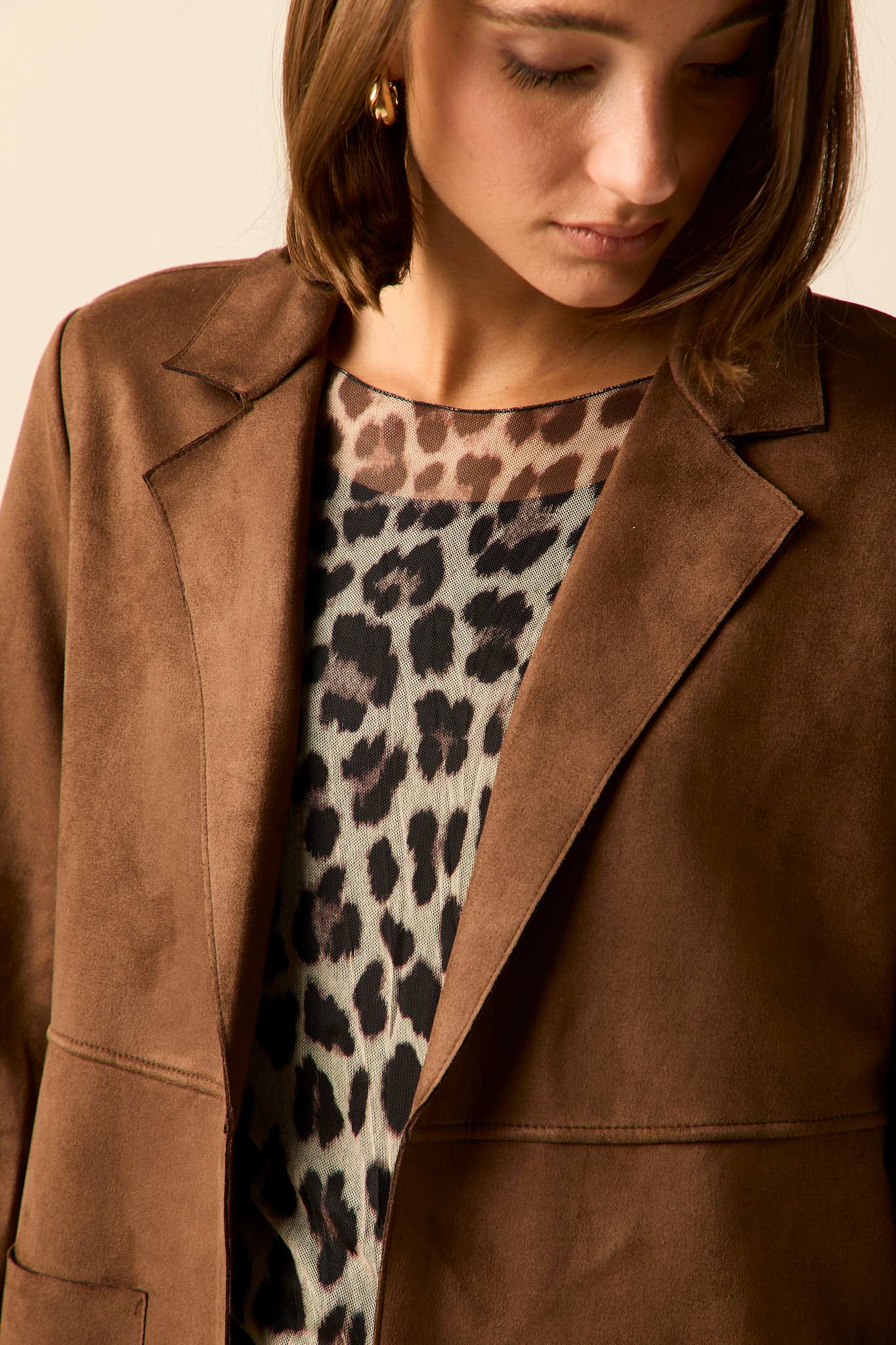 Chaqueta larga de ante en color beige. Manga larga, cuello de solapa y bolsillos laterales.