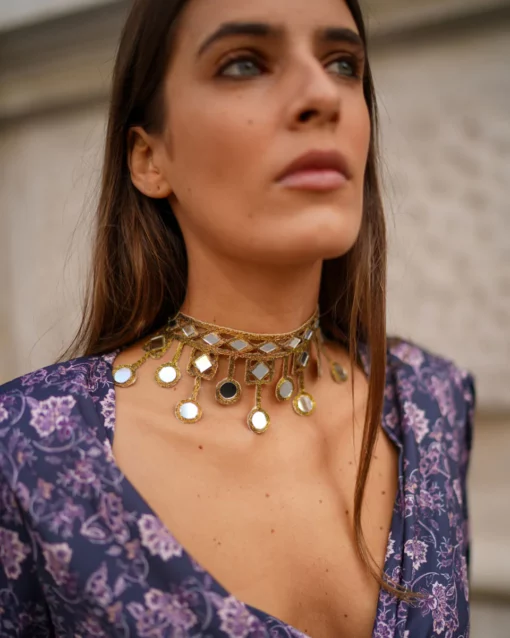 - Material: Hilo dorado y piedras de espejo selladas una a una.