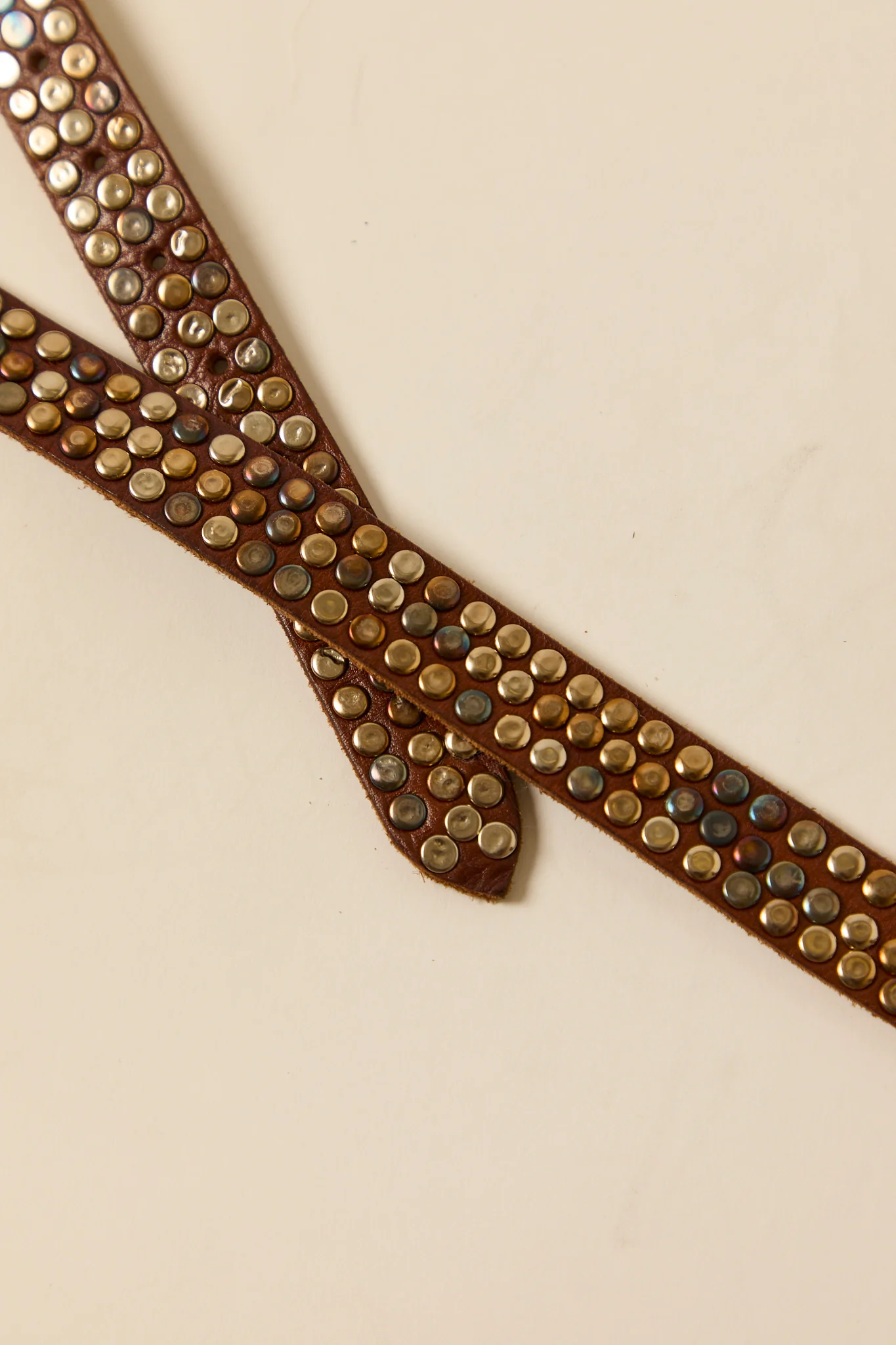 Cinturón de piel en color marrón con detalle de tachas metálicas.