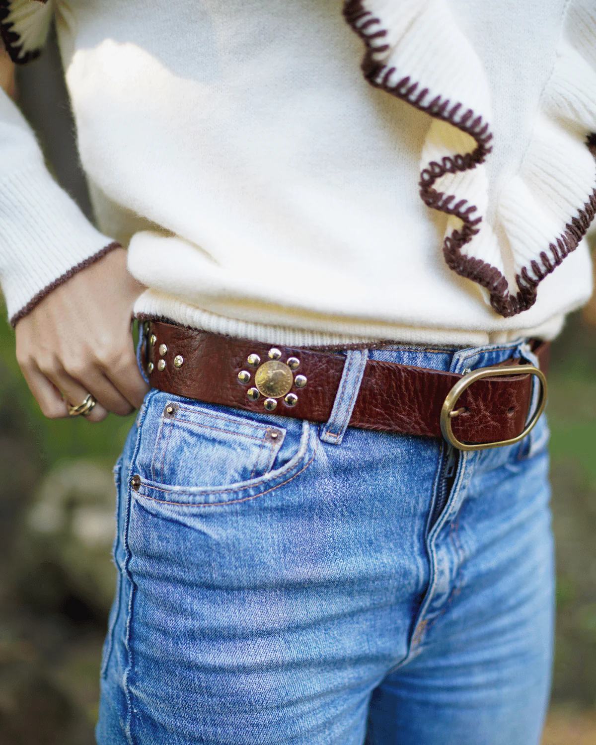 - Cinturón 100% piel con detalle de monedas y tachas.